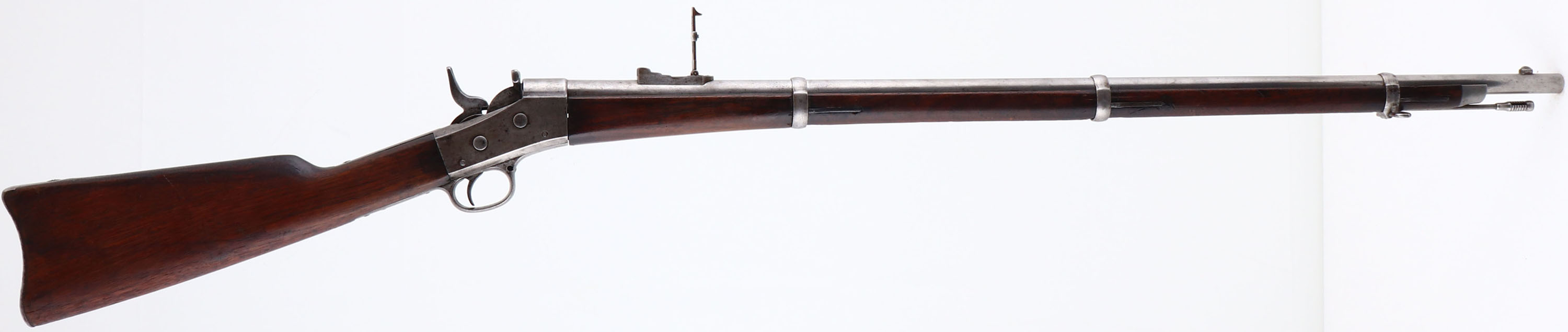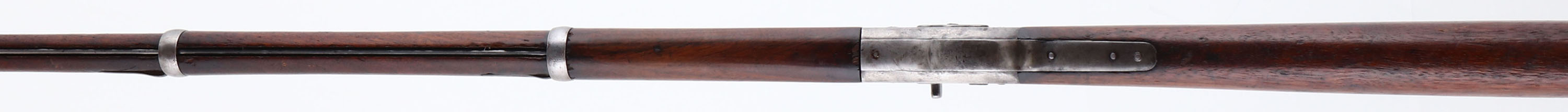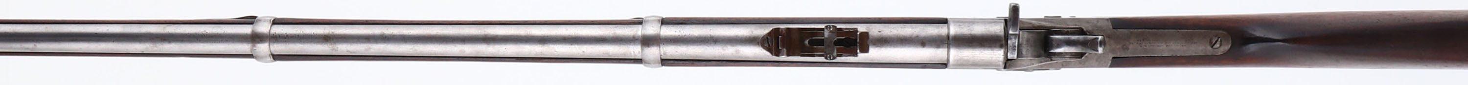 Remington, 1871 Rolling Block Rifle, CAL: 50-70, MFG: circa 1870's, SN: N/A, Single Shot Rolling Block Rifle, 36'' barrel. The upper tang is marked ''''Remingtons' Ilion N. Y. U. S. A. Pat. May3rd Nov 15th 1864 April 17th 1868 AMG 27th 1867 Nov 7th 1871''. The left side of the frame & all three barrel bands have a ''B'' stamping & the left side of the barrel has a ''S'' & the right side has a ''P''. There are non-legible cartouches on either side of the stock. There is a ''25'' cartouche ahead of the buttplate & the top of the buttplate is marked in three lines ''I'', ''S'', ''35''. The full length straight grip wood stock is very good & solid. There are edge chips around the cleaning rod insert, along with contusions, scratches & scrapes. The metal has fully worn to gun metal grey, with areas of spotting, toned to a brown patina. Bore is excellent & bright. The barrel holds a flip-up ladder rear sight, with graduations from 1 to 4 on the left side & 5 to 9 on the front face of the ladder & also holds a blade front sight. Smooth metal buttplate, with pitting. The state of New York purchased about 15,000 rolling block rifles and carbines from Remington circa 1872. These can be distinguished by the extremely high curved hammer spur, thumb lever for the breechblock that protrudes outward instead of up and the safety locking action which automatically returns the hammer to half cock when the breech is closed. They used the standard Remington military round top, rolling block action with a 36-inch round barrel in .50-70 caliber. We believe this to be one of those examples. Antique, No FFL Req. - Value: 1000 to 3000