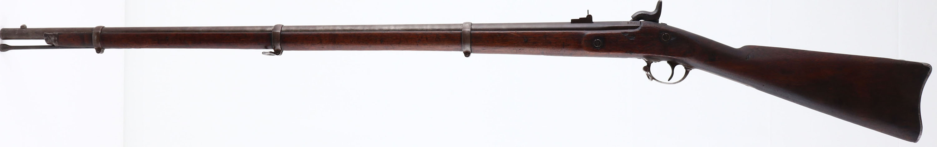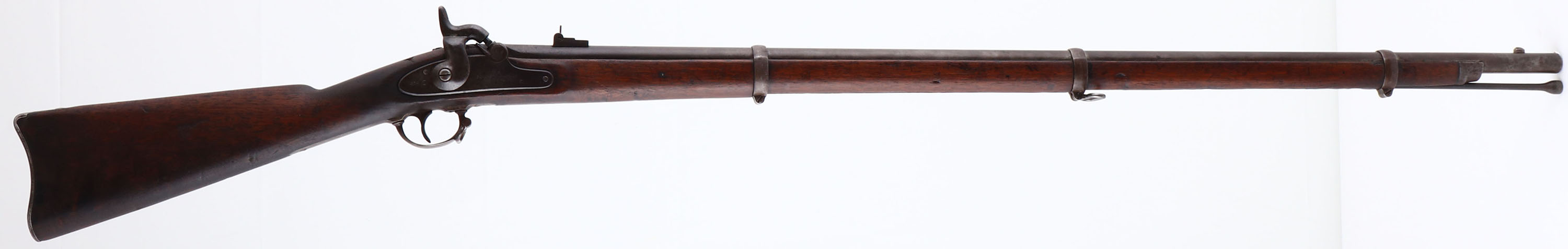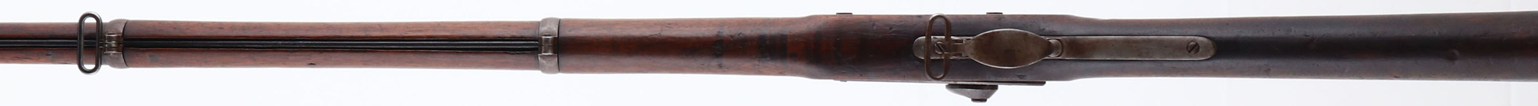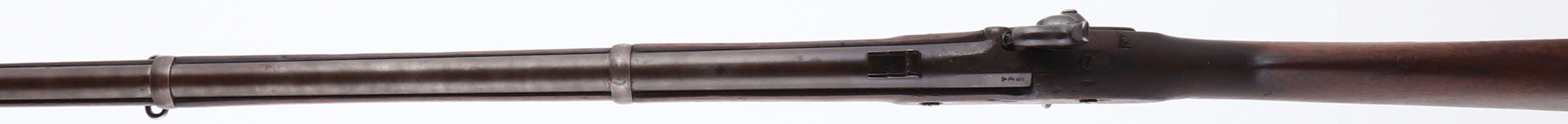 Colt Contract, Model: 1861, Cal: .58, MFG: 1864, S/N: N/A, Percussion muzzleloader, 40'' round barrel. The straight wrist wood stock is very good with scratches, nicks, dings, dents, chips & wear from use/age. The metal has toned to a even brown patina with gray showing in areas & cleaned pitting near nipple. Lock plate is marked, ''1863'', ''U.S.'', ''COLT'S PT F A MFG CO'', ''HARTFORD CT'', left side of barrel is marked, ''V'', over ''P'', over eagle, ''E.P.R. STEEL'', lower tang marked, ''H'' at the front, ''M'' at the rear, upper tang marked, ''W'', all barrel bands marked, ''S'' on left side & ''U'' on right side, has replaced new nipple. Bore is good roughness with visible rifling. barleycorn front sight, three position U-notch leaf rear sight with third leaf missing. Metal buttplate with brown patina & marked, ''US'' on upper tang, bottom sling swivels, has ramrod, comes with original nipple. Antique/muzzle loader No FFL Req. - Value: 500 to 1000
