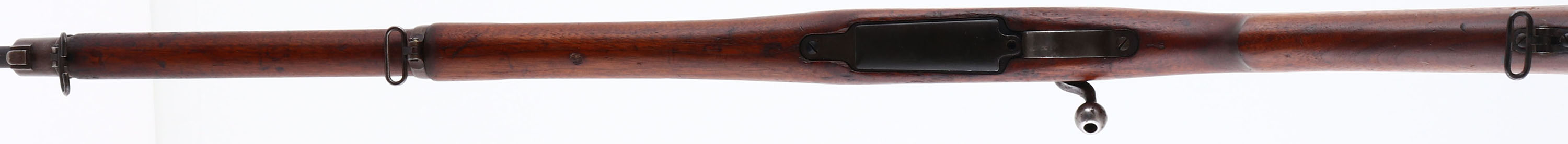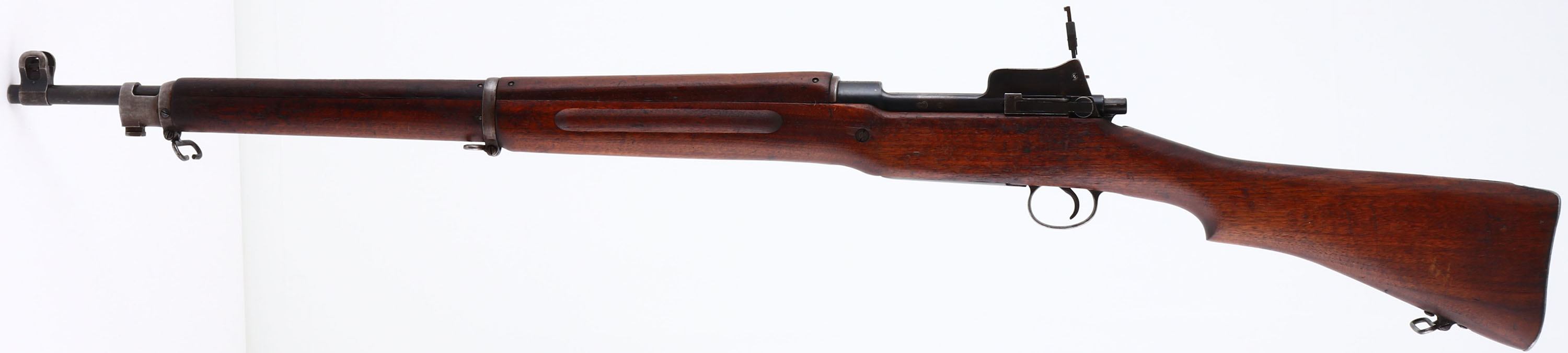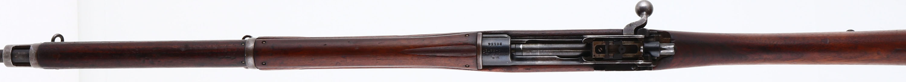 Winchester. Model: 1917. Cal: 30-06. MFG: 1917. S/N: 26154. Bolt action Rifle. 27'' Barrel. The semi Pistol grip wooden stock is very good with scratches, dents, dings, & wear from use/age, faint cartouche on bottom of stock at wrist, ''O.G.E'' in box cartouche on left side of stock above trigger, ''W'' marked on end of wood in front of bayonet lug. The metal finish rates 80% overall with spots of light wear & thinned bluing. Left side of receiver is marked with Flaming bomb & Star inside a circle stamp, Top of receiver is marked ''U.S.'', ''MODEL OF 1917'', ''WINCHESTER'' & S/N, end of barrel is marked ''W'', flaming bomb, ''3-17''. Bore is good, roughness with strong rifling. Blade Front sight with protective wings, aperture ladder rear sight marked 2 to 16. Metal trapdoor buttplate, worn finish, brown patina, & sticker. Bottom sling swivels. FFL Or C&R Req. - Value: 600 to 1200