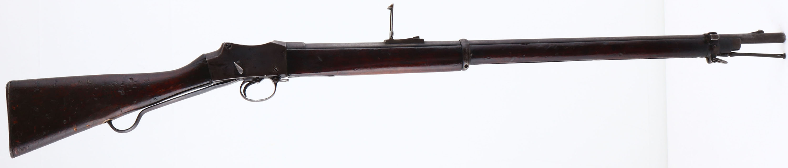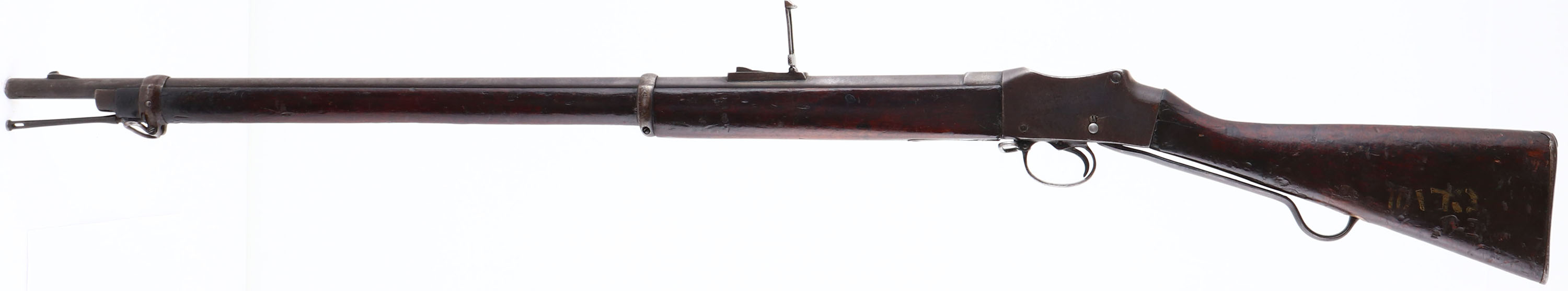 Enfield, Model: Martini-Henry MK-IV, Cal: .577/450, MFG: 1886, S/N: 8960, dropping block breech loading rifle, 33 1/4'' barrel. The straight wrist wood stock is good with nicks, scratches, dings, dents, chips & wear from use & age, stock has darkened from oil & age, stock appears to have had stock replaced at arsenal from a older model of rifle that had a shorter lever, 1 3/4'' by 1 1/4'' inlaid piece of wood with brass cup for hook of lever to go into to on bottom of stock, 3/4'' in diameter circler piece of wood inlaid into bottom of stock with a nail securing, possible repair from where the old hole for where the hook of lever goes into used to be for the older short lever, filler puddy in spots on stock, 1'' by 1'' piece of wood repair inlaid into top of stock by wrist, multiple cracks at wrist of stock emanating from where stock meets receiver, all stock repairs are old & appear to have been done at a military arsenal a very long time ago, lettering/symbols painted in yellow on left side of stock. The metal has toned to a gun metal gray & brown patina with stock finish in areas, right side of receiver is marked crown over, ''V.R'', ''ENFIELD'', ''1886'', crown over downward facing arrow, ''I.V'', ''1.'', bottom of lever is marked with arrow facing up over ''WD'', crown over ''E'', ''20'', ''E-M'', lever appears to have been heated in one area possibly done to bend lever back straight at a arsenal, bottom front tang is marked with arrow facing up over ''WD'', crown over ''82'', ''M'', barrel is marked with S/N lined through ''B'' & proof marks. Bore is very good, shiny with one spot of roughness. Barley corn front sight, U-notch ladder/tangent rear sight marked 100 to 400 on right side of sight base, & ladder is marked 6 to 12. Bottom sling swivels, has cleaning rod. Antique No FFL Req. - Value: 400 to 800