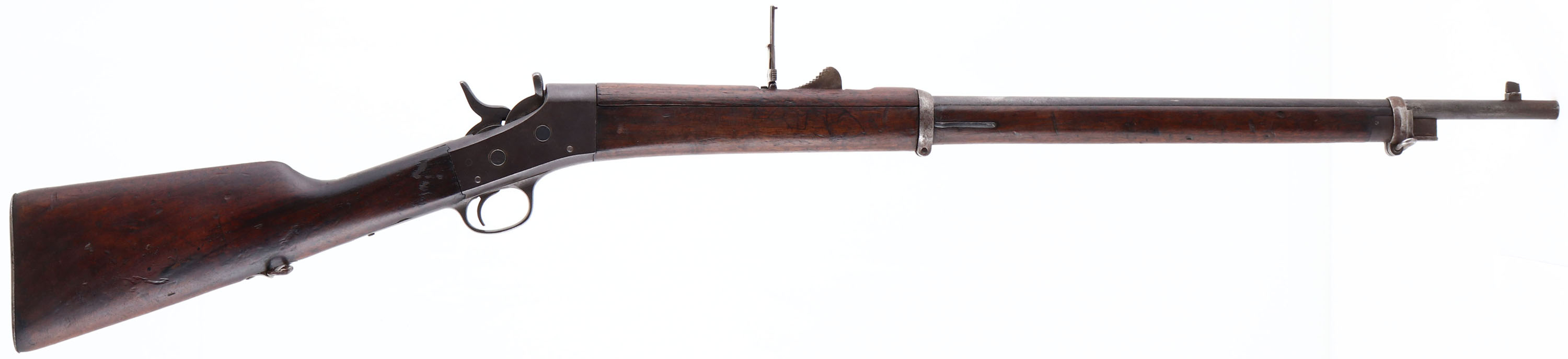 Remington, Model: Rolling block No.5 M1902, Cal: 7x57mm, MFG: 1902-17, S/N: 318, Rolling block breech loading rifle, 36'' Barrel. The straight wrist wood stock is very good with scratches, nicks, dings, dents & wear from use/age, top of upper handguard has two 4 5/8'' cracks running from receiver to cutout for the rear sight, Left side of stock by wrist is marked, ''30''. The metal overall has toned to a even gray/brown patina with areas of gun metal gray showing. Upper tang is marked, ''REMINGTON ARMS COMPANY ILION, NY'', & various patent dates, top of barrel is marked, ''7M.M-S.M.'', S/N marked on left side of lower tang, hidden under stock. Bore is very good, bright with strong rifling. Barley corn front sight, V-notch tangent/ladder rear sight marked 2 to 13 on base & 14 to 21 on ladder. Metal buttplate worn gray with some patina. Bottom sling swivels, missing cleaning rod. These rifles were purchased by many countries and most don't have many if any distinguishing markings on them so its hard to identify where it came from. FFL Or C&R Req. - Value: 500 to 1000