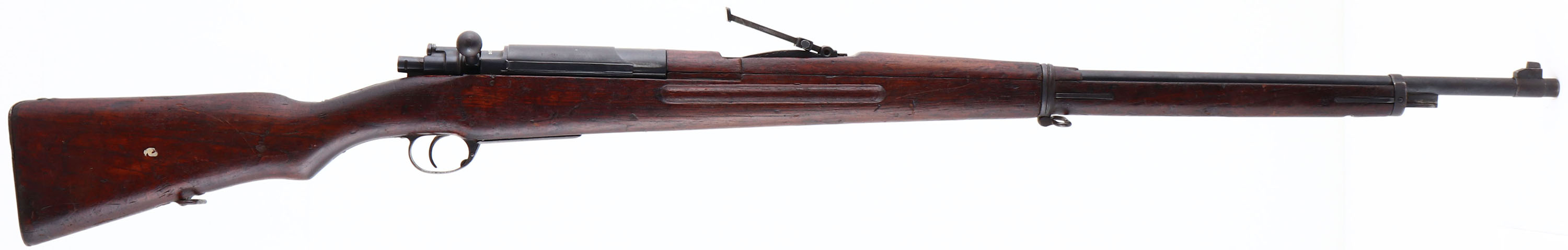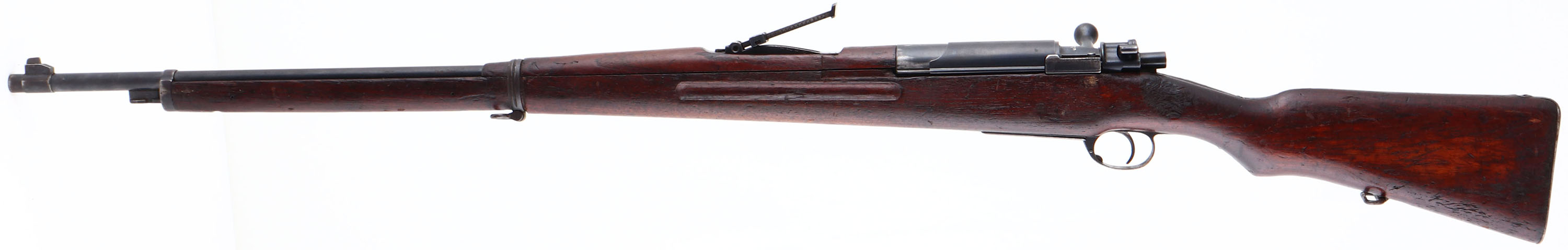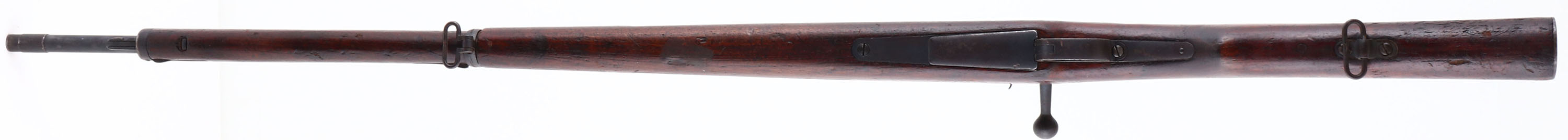 Koishikawa Arsenal, Model: type 46/66 CAL: 8 x 52mmR Siamese, MFG: 1903 -08, S/N: 79356, Bolt Action Rifle, 29 3/8'' barrel. The semi-pistol grip wood stock is very good with contusions, scratches, scrapes & dings, darkening from age/oil, Type A cartouche on bottom of stock in front of sling swivel. The metal finish rates 85% overall, with spots worn gray. Top of receiver is marked with Siamese crest & ''R.S.121'' in Thai, receiver bridge is marked with original S/N in Thai Numerals & reads ''36302''. The left side of receiver is marked with importer S/N, Arsenal mark & type B stamp. Bore is very good, bright with light roughness in spots. The barrel holds a barleycorn front sight & V-notch ladder rear sight marked 2 to 20 in Thai Numerals. Buttstock carries a military style trapdoor buttplate, with brown patina & rust. missing cleaning rod. FFL or C&R Req - Value: 200 to 400