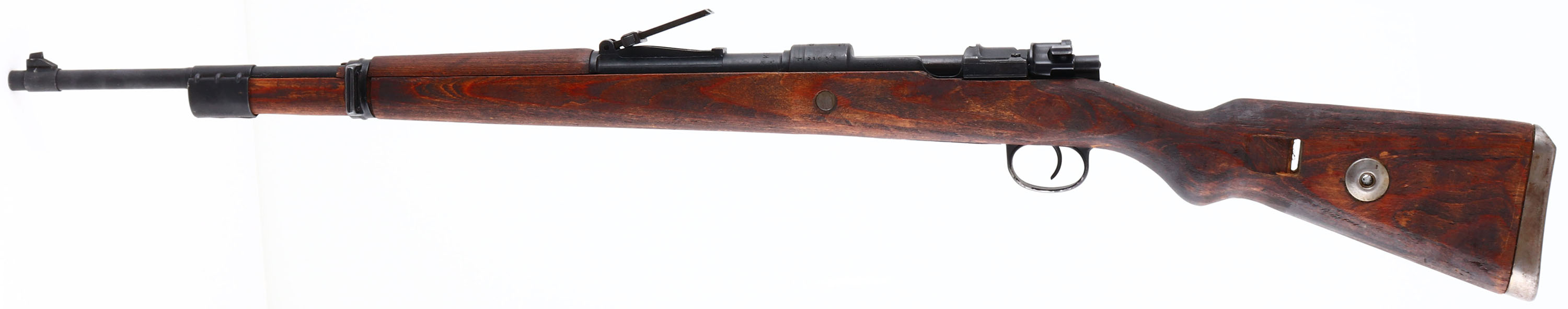 Waffenfabrik Brunn (Czech), Model: K98K, CAL: 7.92x57mm, MFG: 1944, S/N: 21053, Bolt Action Rifle, 24'' Barrel. The original semi pistol grip laminated wood stock is very good with light scratches, dings, dents & wear from use/age, chip in upper handguard in front of barrel band, bolt disassembly disc in rear of stock, S/N marked on the left side of stock behind the bolt disassembly disc. The metal finish rates 90% overall with light scratches & wear. Left side of receiver is marked with iron eagle Waffenamt proof marks, S/N, & ''Mod''. 98'', top of receiver is marked, ''dot'', faint proof mark, & ''1944'', right side of receiver is marked with proof marks, one is a eagle over ''63'', left side of barrel is marked ''dot 13'' inside a crest, & a Waffenamt iron eagle proof mark, top of barrel is marked ''KE'', & a eagle over ''63'' proof mark, S/N mismatched bolt. Bore is Very good, bright & shiny with one spot of roughness. The barrel holds a barleycorn front sight & v-notch tangent rear sight marked 1 to 20. Metal buttplate with brown patina. Side sling mounts, no hole for cleaning rod which is factory. A excellent example of a late war K98k. FFL or C&R Req. - Value: 600 to 1200