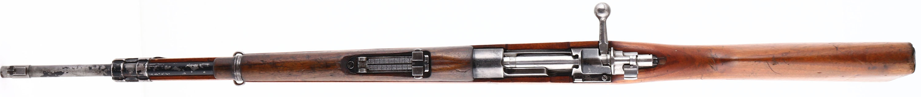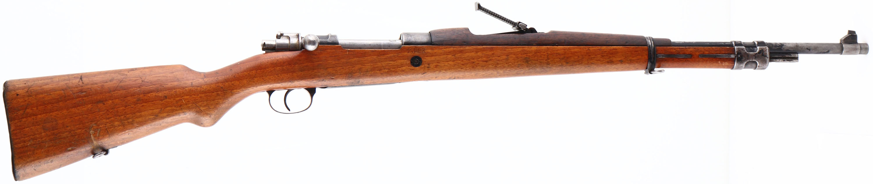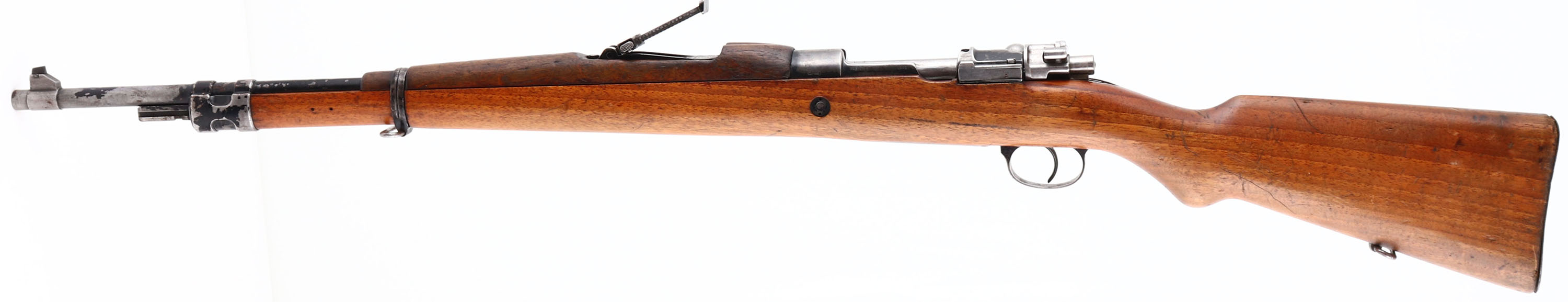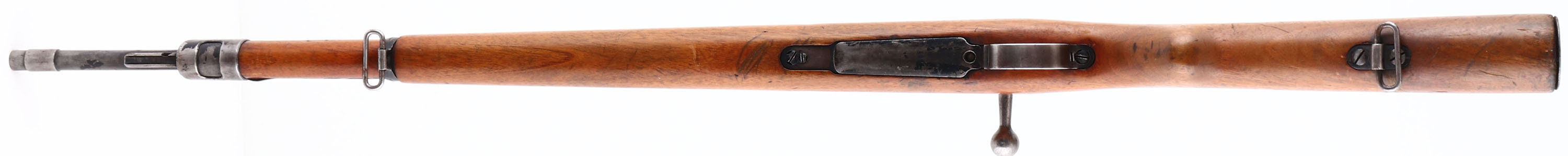 Fabrique Nationale D'Armes De Guerre (FN), Model: 1950 Short rifle, Cal: 30-06, MFG: 1952, S/N: 21602, Bolt action rifle, 23'' Barrel. The original semi pistol grip wood stock is very good with scratches, dings, dents & wear from use & age, S/N marked on right side of stock above recoil lug, discolored replaced upper handguard. The black stoving over parkerized metal finish rates 25% with most of the black paint gone showing parkerized finish underneath. Left side of receiver is marked, ''FAB.NAT. D'ARMES DE GUERRE'', ''HERSTAL-BELGIQUE'', & proof marks, top of receiver is marked, crown over ''B'', ''ABL'', ''1952'', right side of receiver is marked with S/N, S/N Matched Bolt. Bore is very good, bright & shiny with strong rifling, one spot of roughness near muzzle. Barleycorn front sight, V-notch tangent rear sight marked 1 to 19. Metal grooved buttplate worn gray & with rust. Bottom sling swivels. FFL Or C&R Req. - Value: 250 to 500