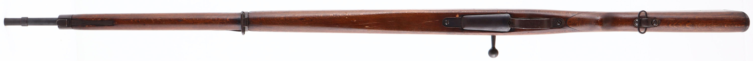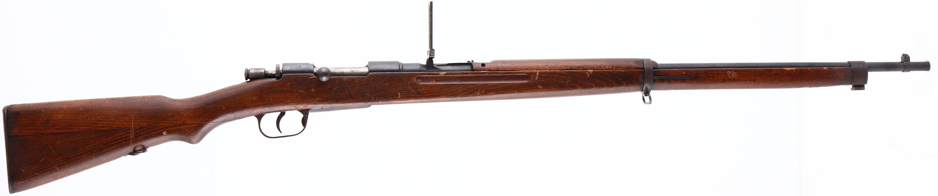 Italian, Type I Rifle, CAL: 6.5x50mmSR, MFG: 1938-39, S/N: G9746, Bolt Action Rifle, 30 1/2'' barrel. The semi-pistol grip wood stock is very good, with contusions, scratches, scrapes, nicks & dings, darkened with oils over time, glue on stock under the upper handguard, 3/4'' hairline crack on upper handguard by rear sight. The metal finish rates 85% overall, with a mix of metal grey & brown patina. The magazine floor plate & trigger guard have rust speckling. The left side of barrel is marked with S/N. Bore is good, bright with worn rifling near muzzle. The barrel holds a barleycorn front sight & V-notch ladder rear sight marked 5 to 24. Buttstock carries a military style buttplate, with brown patina & cleaned pitting. Missing cleaning rod. These rifles were made by the Italians under contact for the Japanese navy. FFL or C&R Req - Value: 200 to 400