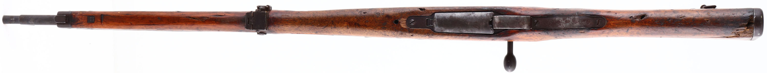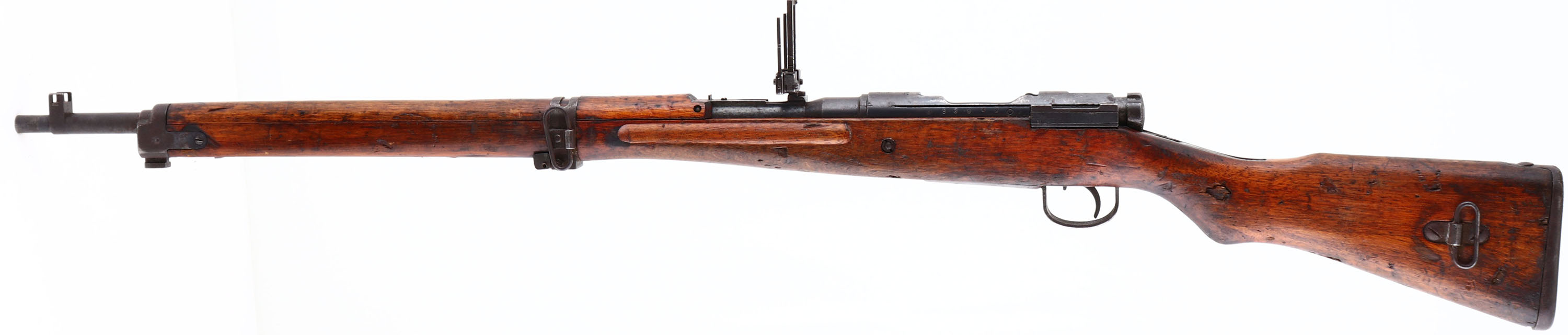 Nagoya Arsenal, Model: Type 99, Cal: 7.7 Jap, MFG: 1939-1945, S/N: 53949, 2nd serial block, Bolt Action Rifle. 25 5/8'' Barrel. The semi pistol grip wood stock is very good with scratches, chips, dents, gouges & wear from use/age, possible shrapnel damage at toe of stock. The metal finish rates 85% overall with small spots of wear & patina. Left side of receiver is marked with S/N, arsenal stamp, top of receiver is marked with chrysanthemum & ''Type 99'' In Japanese, S/N mismatched bolt. Bore is very good, bright with thinned rifling. Barleycorn front sight with protective ears, Aperture Ladder rear sight marked 3 to 15, Has folding anti-aircraft sight wings & are marked 2 to 3. Metal Butt plate with wear & brown patina. Side sling swivels, missing cleaning rod. FFL Or C&R Req. - Value: 250 to 500