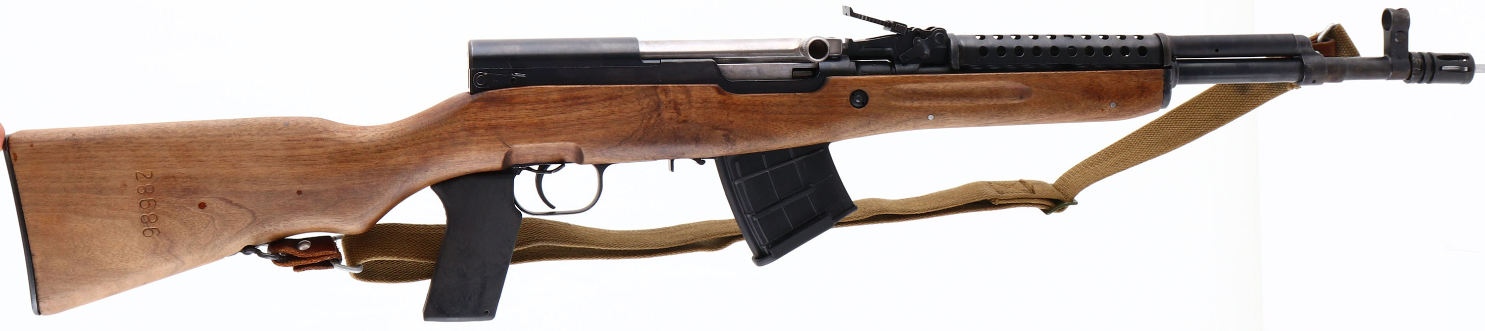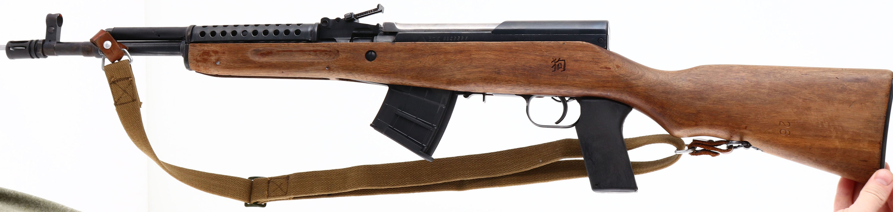 Chinese (Factory 26), Model: Type 56 SKS Paratrooper, Cal: 7.62x39mm, MFG: 1964, S/N: 9128686, Semi-Auto Rifle, 16 1/2'' Barrel, The Original Semi Pistol grip Wood stock is good with light dings, nicks & scratches, stock appears to have been lightly sanded, polymer pistol grip has been added and has extra steel ventilated handguard, S/N is marked on the right side of the stock, left side of stock is marked ''26'' near rear sling swivel & has Chinese lettering cartouche above the trigger, the original wooden handguard has been replaced with a metal ''cheese grater'' style of handguard. The Metal finish rates 90% Overall with spots of thinned bluing, Left side of receiver is marked with Factory 26 code, three Chinese characters that translate to ''TYPE 56 CARBINE'', S/N & importer marks, left & right side of barrel have proof marks. Bore is excellent, shiny with proud rifling. Hooded Front Post, U-Notch tangent rear sight marked 1 to 10, Metal Trapdoor buttplate, Comes with Cleaning kit inside buttstock, canvas sling, four polymer pro mag 10rd magazines, missing Folding bayonet & missing cleaning rod, Rear bottom sling mount, front side mounted sling bar, flash hider is crooked & we recommend getting it fixed or remove it before shooting. FFL Or C&R Req. - Value: 300 to 600