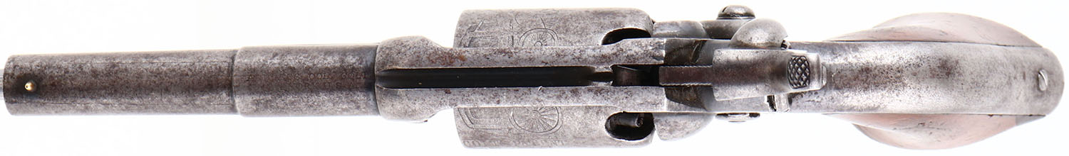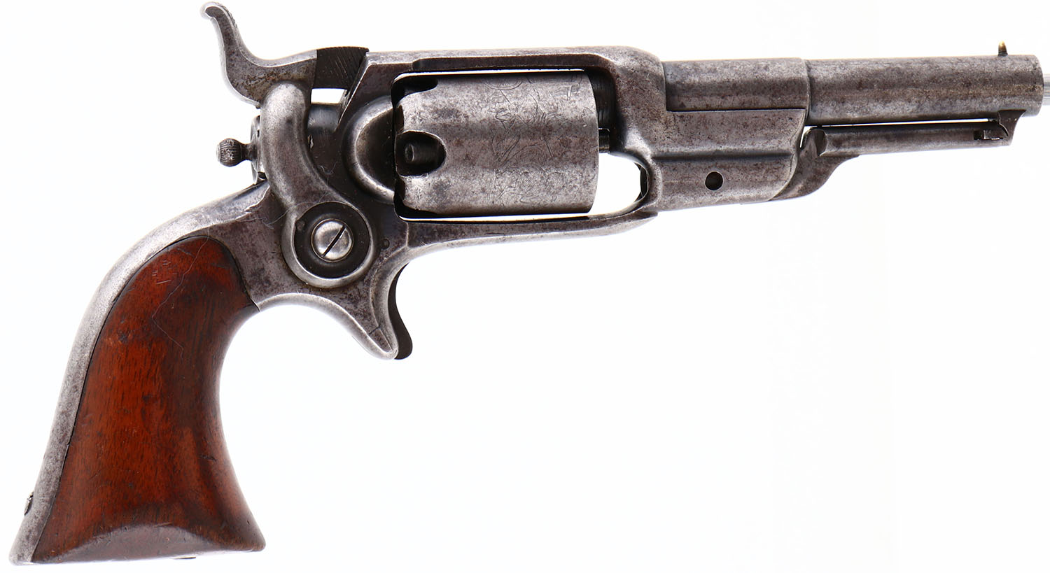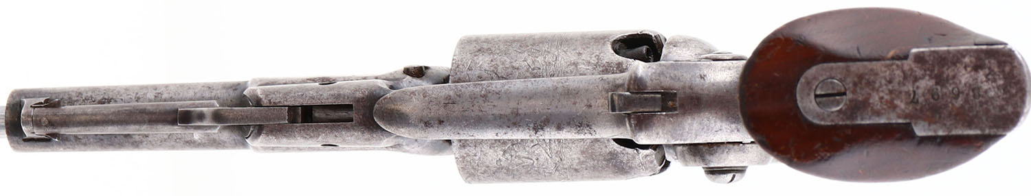 Colt, Model 1855 Sidehammer Pocket Revolver, (Model 6), CAL:31, MFG: 1864, SN: 8697, Single Action Percussion Revolver, 3 1/2'' barrel. This model is also known as also known as the Colt Root Revolver after engineer Elisha K. Root. The barrel is marked ''ADDRESS COL COLT NEW-YORK U.S.A'' in two lines. The full SN can been seen on the butt & on the cylinder. The cylinder scene engraved on the first 25,000 pistols was created by banknote engraver Waterman Ormsby. The image was his fourth & last to be featured on Colt revolvers. At one end of the scene is the text, ''COLT'S PATENT No. [8697]''. The original wood grips are very good & solid, having been refinished. There is a small edge chip repair on the left grip, alongside other contusions & light scrapes. The metal finish has worn to metal grey, with rust speckling, toned to a brown patina & remnants of blue in protected areas. Bore is very good & reflective, with intermittent pitting. Brass front sight. Antique, No FFL Req. - Value: 1000 to 2000