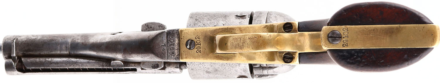 Colt, Model 1862 Police & Pocket Pistol of Navy Caliber, CAL: 36, MFG: 1865, SN: 29102, Single Action Revolver, 4 1/2'' barrel. The top of the barrel has no address marking. The right side of the frame has two patent dates in two lines '' PAT JULY 25 1871'' & ''PAT JULY 2 1872''. The caliber marking can been seen on the trigger guard. All matching SN on the butt, trigger guard, frame & barrel housing. Non-matching cylinder with SN ''477102''. The refinished, original wood grips are excellent, with contusions & scrapes. The metal has fully worn to gun metal grey, with cleaned rust pitting, toned to a dark brown patina. The trigger guard & backstrap are brass, with a thin aged patina. Bore is very good, with consistent roughness & intermittent pitting. The barrel holds a worn front bead. Antique, No FFL Req. - Value: 1000 to 3000