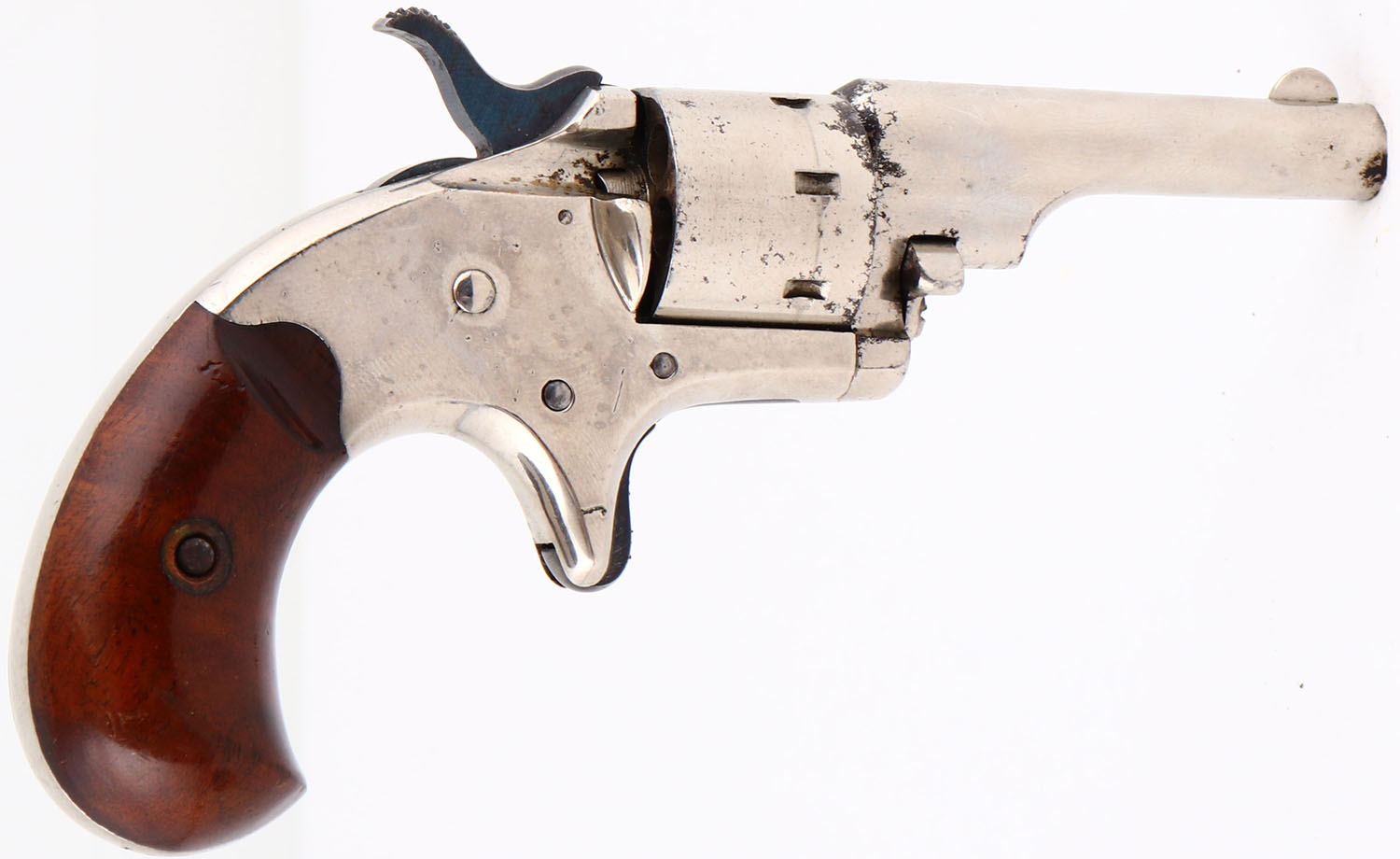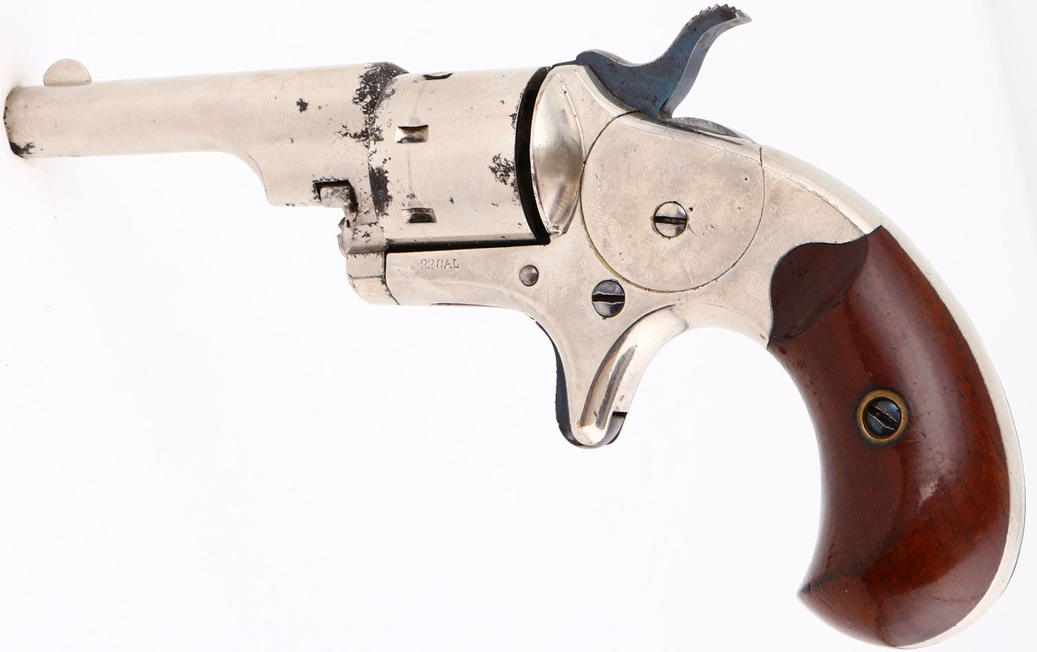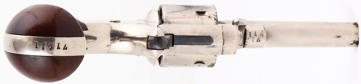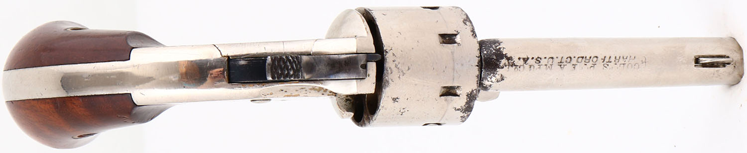 Colt, Open Top Pocket Model, CAL: 22, MFG: 1871-77, SN: 71911, Single Action Revolver, 2 3/8'' barrel. The top of the barrel is marked in two lines ''COLT'S PT F.A. MFG. CO. HARTFORD CT. U.S.A.''. The left side of the frame is marked ''22 CAL''. The full SN can be found on the butt & bottom of barrel housing. The original bird's head wood grips are excellent, with minor handling marks. The silver plated finished rates 90% overall. Hammer is blued. Bore is good, with pitting throughout. The barrel holds a small blade front sight. Colt made appx 114,000 of these small, spur-trigger, .22 caliber pocket revolvers. These revolvers were well-made & popular, but Colt eventually found it difficult to compete with cheaper pocket pistols that flooded the market during the era. Antique, No FFL Req. - Value: 500 to 1000
