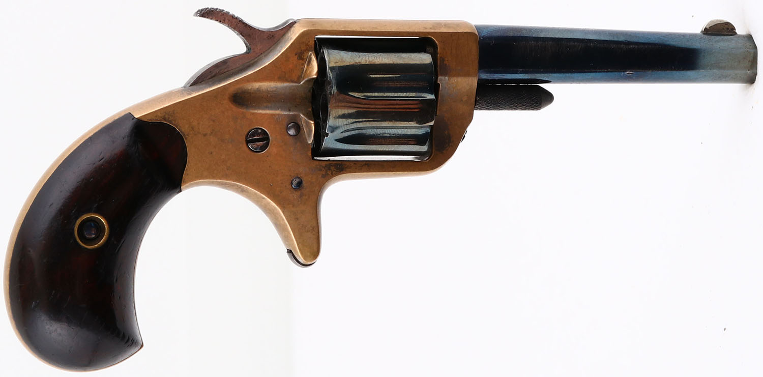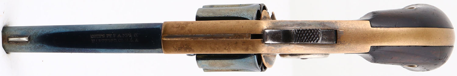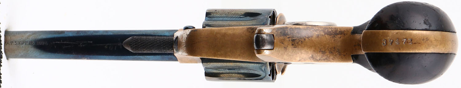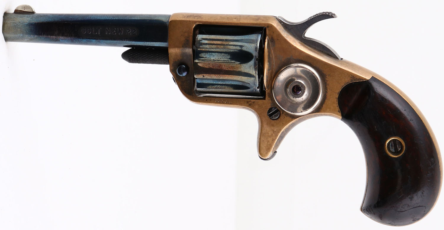 Colt, New 22 (New Line), CAL: 22, MFG: 1876, SN: 37472, Single Action Revolver, 2 3/4'' barrel. The top of the barrel is marked in two lines ''COLT'S PT F.A. MFG. CO. HARTFORD CT. U.S.A.''. The left side of the barrel is marked ''COLT NEW 22''. The full SN can be seen on the butt & the partial correct SN ''7472'' on the bottom of the barrel. There's also a very small ''102'' on the bottom of the barrel ahead of the partial SN. The original bird's head wood grips are excellent. There are contusions, scrapes & areas of flaking to the varnish finish. The current metal blue finish on the barrel & cylinder rates 85%, with scuffs & areas of loss worn to a metal grey. The original nickel finish has nearly worn completely from the brass frame, with some remnants remaining in more protected areas. Bore is good, but with roughness & light pitting. The barrel holds a small blade front sight. Antique, No FFL Req. - Value: 200 to 600