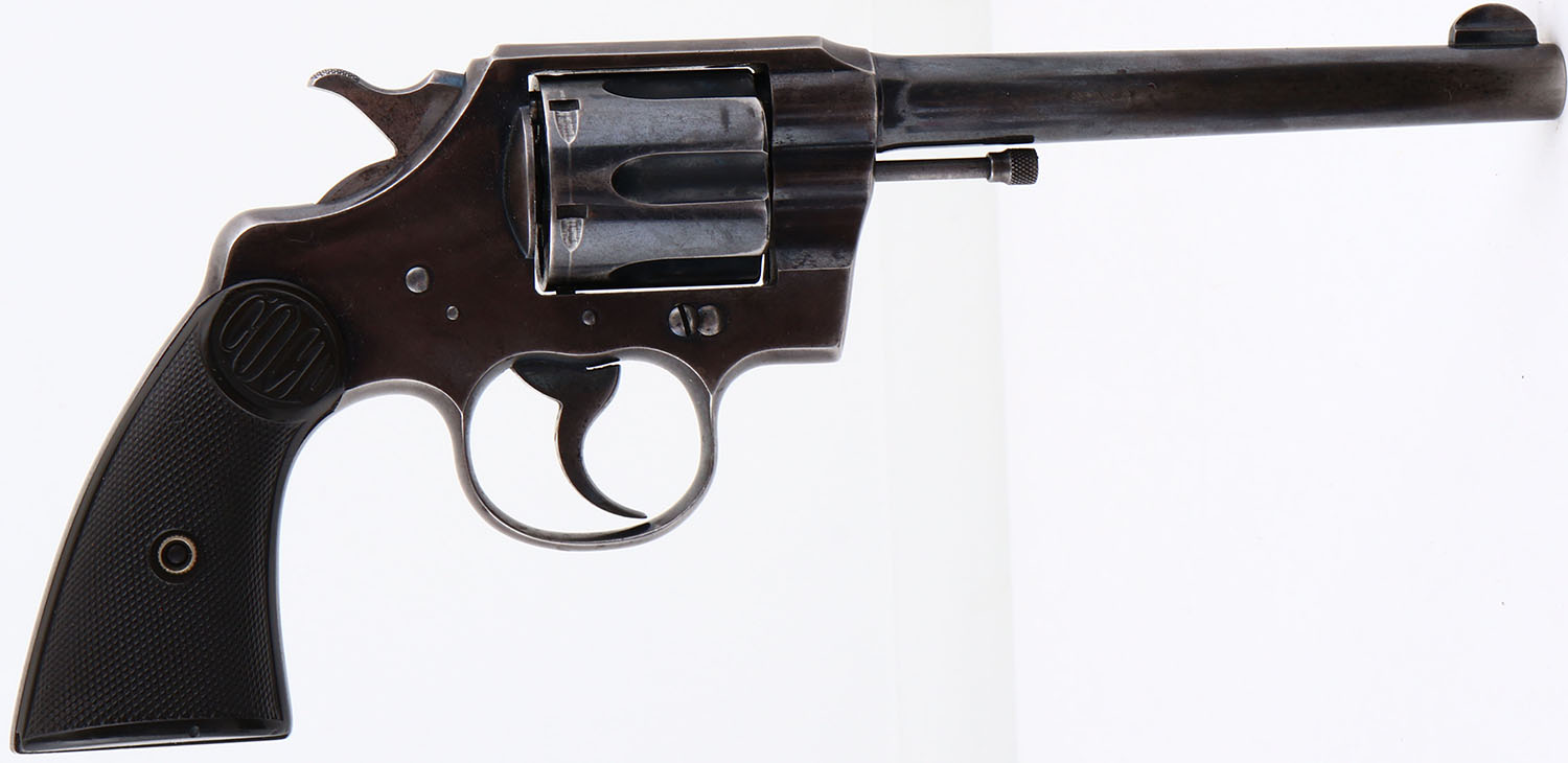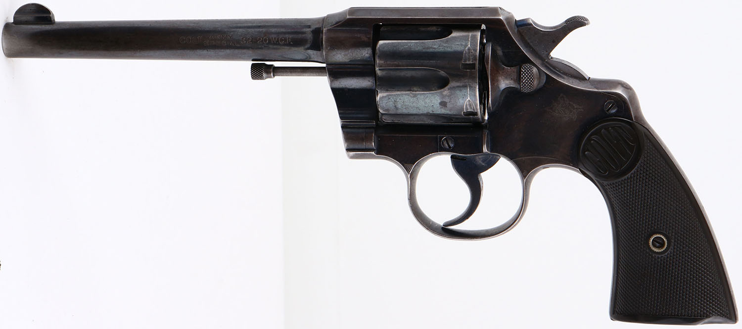 Colt, Army Special, CAL: 32-20 WCF, MFG: 1910, SN: 324373, Double Action Revolver, 6'' barrel. The top of the barrel is marked in two lines ''COLT'S PT F.A. MFG. CO. HARTFORD CT. U.S.A.'', ''PAT'D AUG.5.1884 JUNE 5.1900 JULY 4 1905''. The left side of the barrel is marked ''COLT ARMY SPECIAL 32-20 W.C.F''. The left side of the frame is marked with the Rampant Colt logo. The full SN can be found on the frame & cylinder swing gate. The original, Colt marked checkered hard rubber grips are very good, with a worn edge chip on the bottom of the left grip. The metal blue finish rates 40%, with areas worn to metal grey & toned to a brown patina. Bore is excellent, with roughness between rifling. The barrel holds a blade front sight. Released in 1908 as the Colt Army Special, the revolver was renamed the ''Colt Official Police'' in 1927 in order to better market to law enforcement agencies. It became one of the best-selling police firearms of all time, eventually coming to exemplify typical law enforcement officer weaponry in the 1950's. FFL or C&R Req. - Value: 500 to 1000