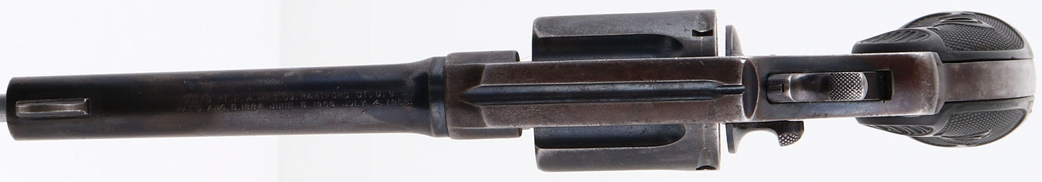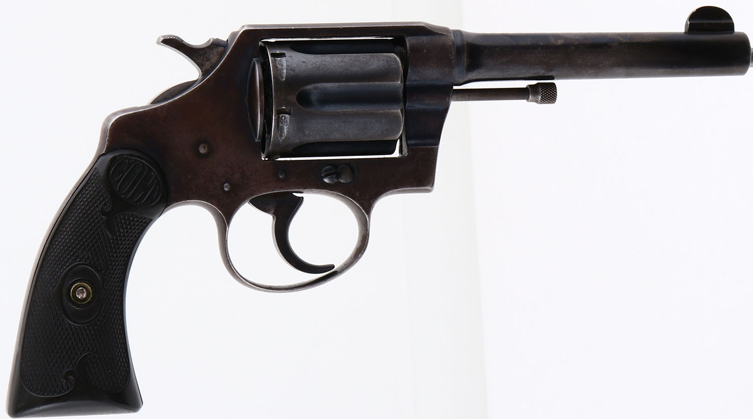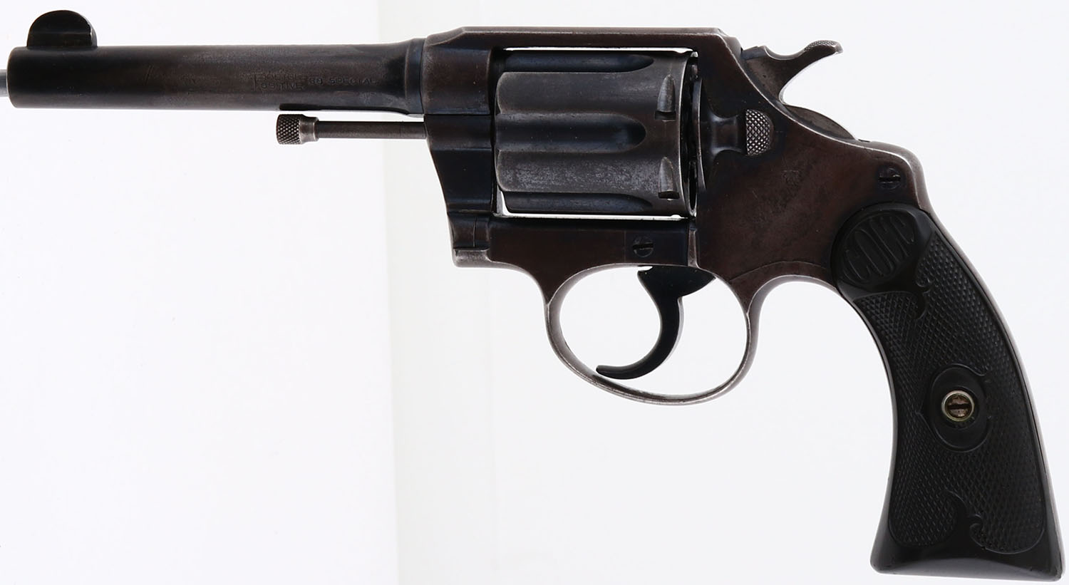 Colt, Police Positive, CAL: 38 SPL, MFG: 1919, SN: 182269, Double Action Revolver, 4 1/2'' barrel. The top of the barrel is marked in two lines ''COLT'S PT F.A. MFG. CO. HARTFORD CT. U.S.A.'', ''PAT'D AUG.5.1884 JUNE5.1900 JULY 4 1905''. The left side of the barrel is marked ''POLICE POSITIVE 38 SPECIAL''. The left side of the frame is marked with the Rampant Colt logo behind the cylinder release. The full SN can be found on the frame & cylinder swing gate. The original, Colt marked checkered plastic grips are excellent. The metal blue finish has worn to a mix of meta grey, brown patina & remaining original blue. Bore is very good, with roughness & intermittent pitting. The barrel holds a blade front sight. The Police Positive was very successful, along with the Colt Official Police. They dominated the law enforcement firearms market in the early 1900's. FFL or C&R Req. - Value: 300 to 600