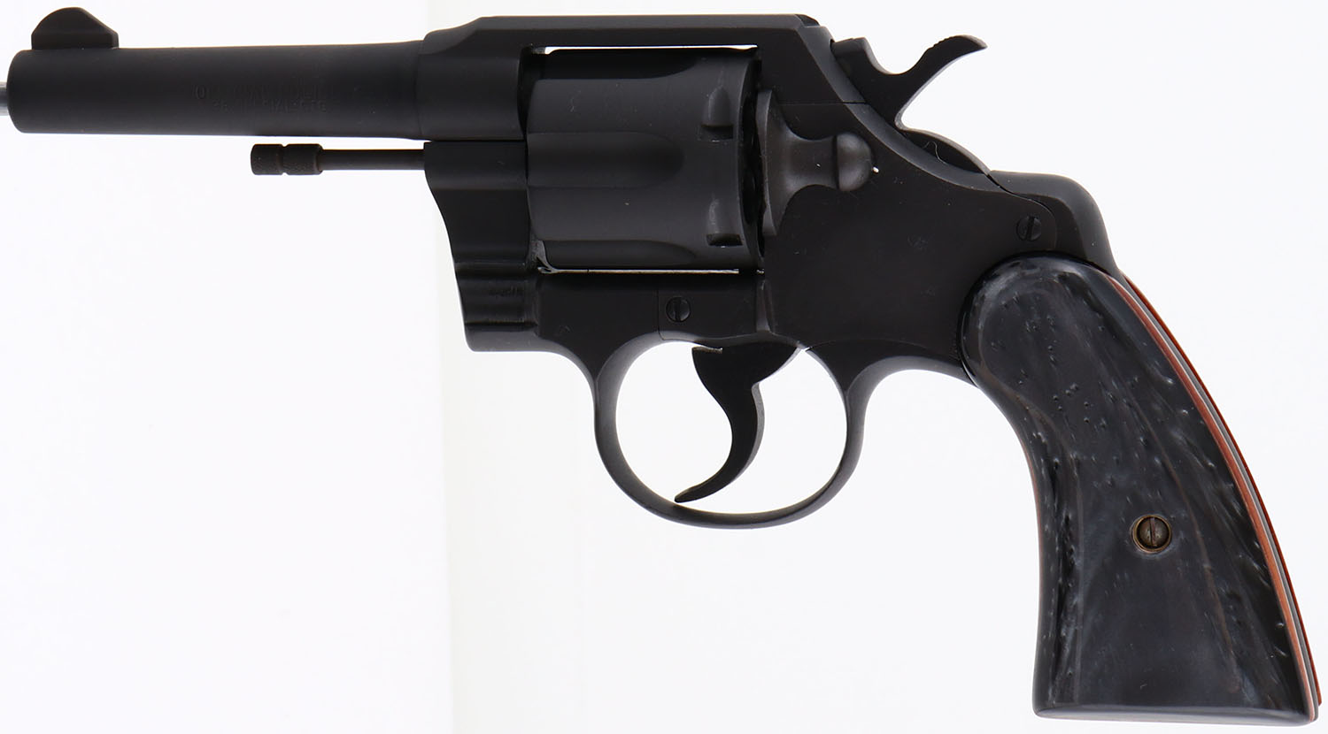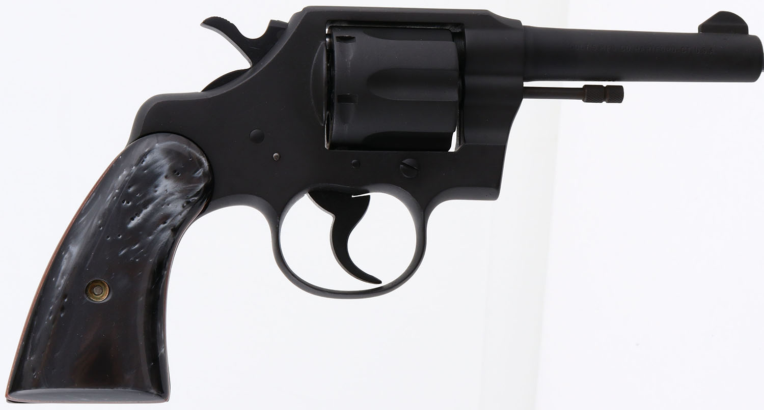 Colt, Official Police, CAL: 38 SPL, MFG: 1961, SN: 778055, Double Action Revolver, 4'' barrel. The custom grips are excellent. The restored matte black finish rates 99%, with cleaned pitting underneath. Bore is good with consistent spotting throughout. The barrel holds a blade front sight. A good utilitarian revolver. FFL or C&R Req. - Value: 300 to 600