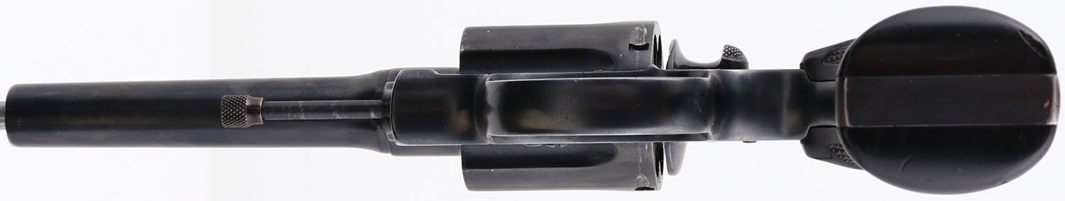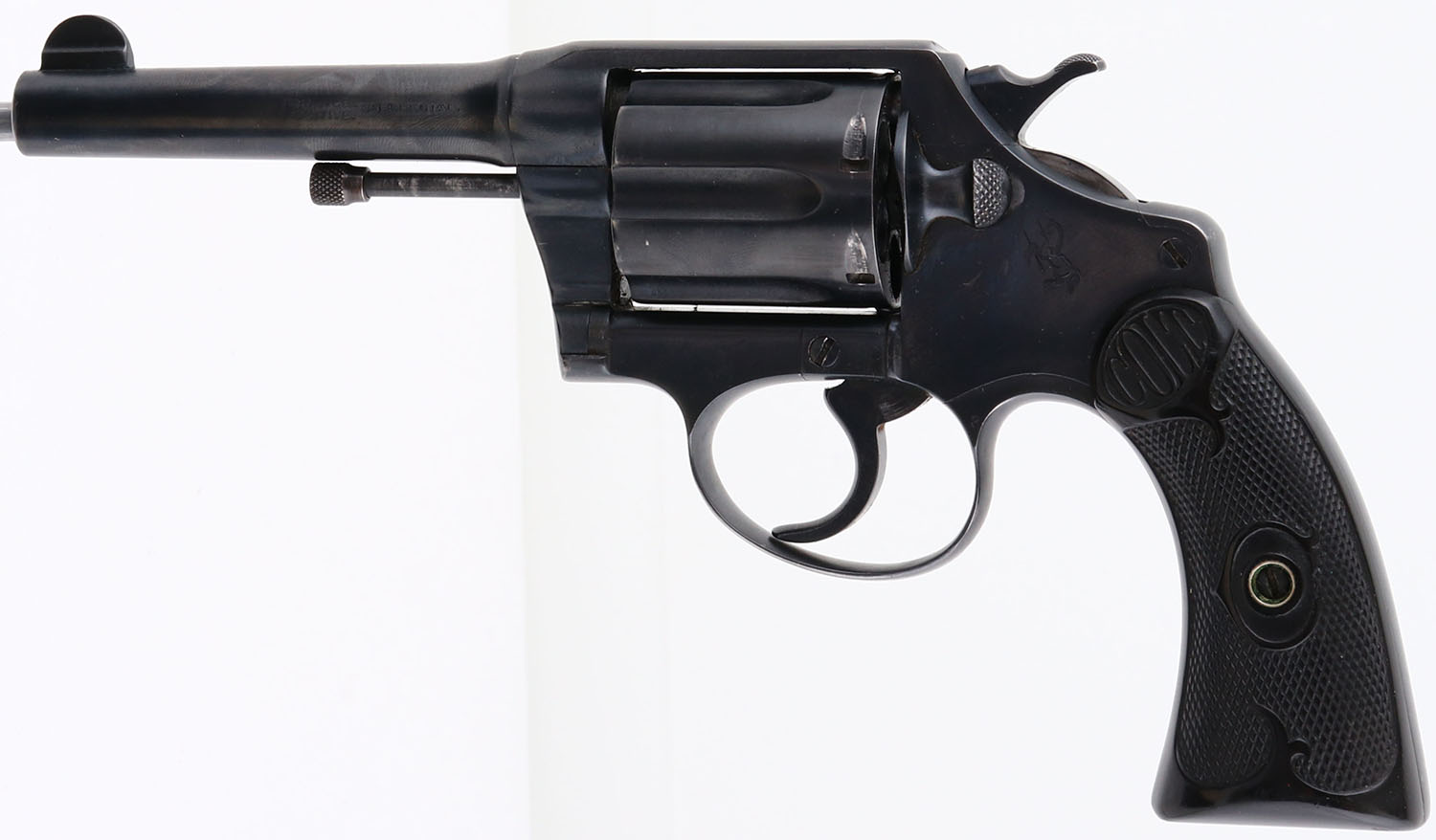 Colt, Police Positive, CAL: 38 SPL, MFG: 1919, SN: 162846, Double Action Revolver, 4'' barrel. The top of the barrel is marked in two lines ''COLT'S PT F.A. MFG. CO. HARTFORD CT. U.S.A.'', ''PAT'D AUG.5.1884 JUNE5.1900 JULY 4 1905''. The left side of the barrel is marked ''POLICE POSITIVE 38 SPECIAL''. The left side of the frame is marked with the Rampant Colt logo behind the cylinder release. The full SN can be found on the frame & cylinder swing gate. The original, Colt marked checkered hard rubber grips are excellent. The restored metal blue finish rates 98%, with cleaned pitting underneath. Bore is excellent & bright, with intermittent roughness. The barrel holds a blade front sight. Comes in a non-factory box. FFL or C&R Req. - Value: 400 to 800