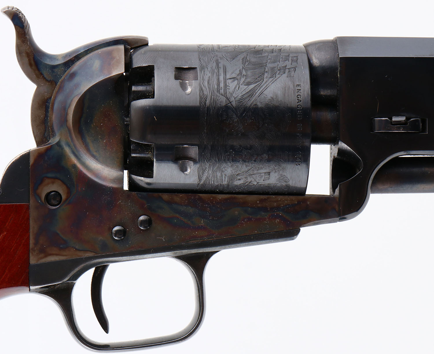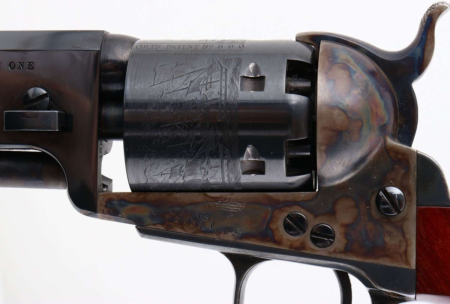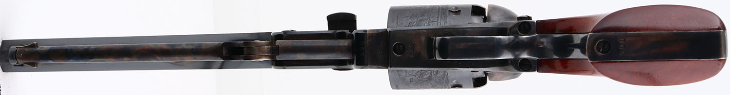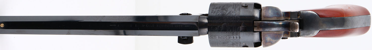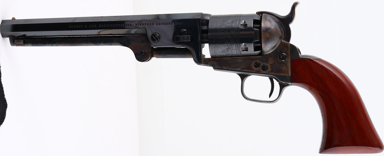 Colt, Model 1851 Navy, Robert E. Lee Commemorative. 2nd Gen. Colt Re-Issue, CAL: 36, MFG: 1971, SN: 590, Single Action Percussion Revolver, 7 1/2'' barrel. The left side of barrel is stamped ''ROBERT E. LEE COMMEMORATIVE NINETEEN SEVENTY ONE''. The original wood grips are excellent, but with several finish level scrapes mostly on the right grip. The metal blue finish on the barrel & cylinder rates 99%+. The frame & pack rod are case-hardened, retaining full case-color. The trigger guard & back strap are blued & excellent. Bore is mint. The barrel holds a single brass front bead. Black Powder, No FFL Req. - Value: 400 to 800