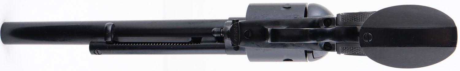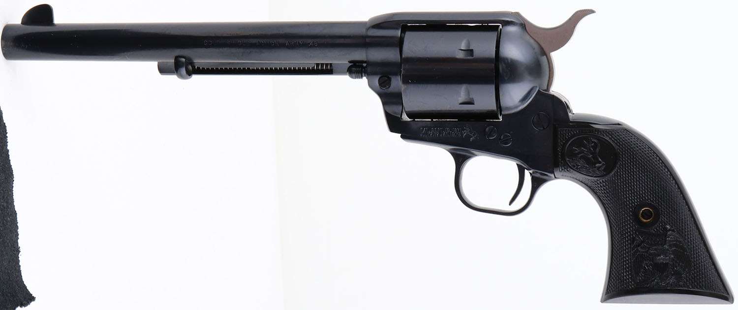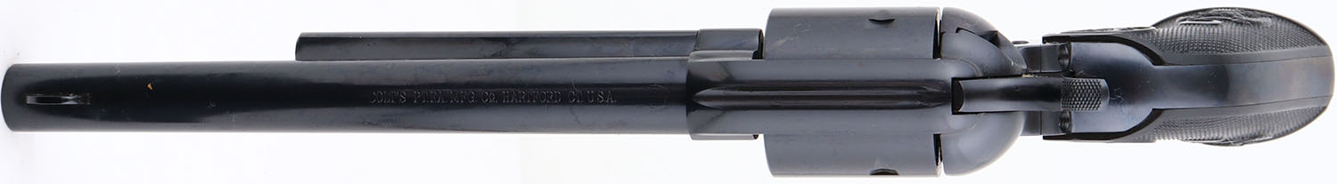 RARE BOXED, Colt, Model Single Action Army, Sheriffs Model, (P1870UB), CAL: 45, MFG: 1978, SN:94053SA, Single Action Revolver, 7 1/2''' barrel. This is a NEW OLD STOCK revolver with factory grease still on all surfaces & stored in its original box. According to the consignor, this particular revolver is special as it is one of only 58 examples with unfluted cylinder. The left side of barrel is stamped ''COLT SINGLE ACTION ARMY .45''. The original Eagle & Rampant Colt, checkered grips are Mint. The metal blue finish on the barrel & cylinder rates 100%. Bore is mint. The barrel holds a tall front blade. Comes with the colt purchase letter from Colt President, in the original wood grain box, with paperwork & wrappings. Extremely collectible NOS Colt revolver, with rare feature. FFL Req. - Value: 1800 to 3000