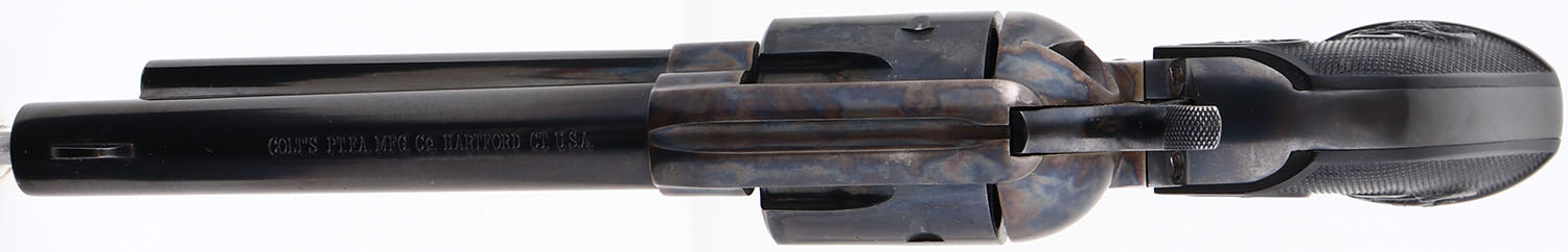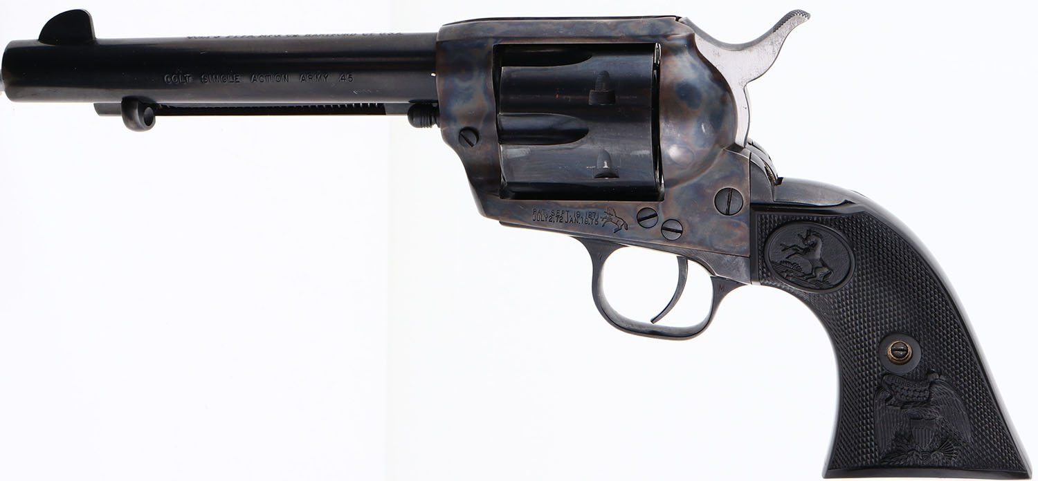 BOXED, Colt, Model Single Action Army, Sheriffs Model, (P1850), CAL: 45, MFG: 1975, SN:70709SA, Single Action Revolver, 5 1/2''' barrel. The left side of barrel is stamped ''COLT SINGLE ACTION ARMY .45''. The original Eagle & Rampant Colt, checkered grips are Mint. The metal blue finish on the barrel & cylinder rates 98%, with loss at barrel tip & slight cylinder loss. Bore is mint. The barrel holds a tall front blade. Comes with the colt purchase letter from Colt President, in the original wood grain box, with paperwork & extra cylinder rod. Excellent boxed Colt revolver. FFL Req. - Value: 1500 to 2500