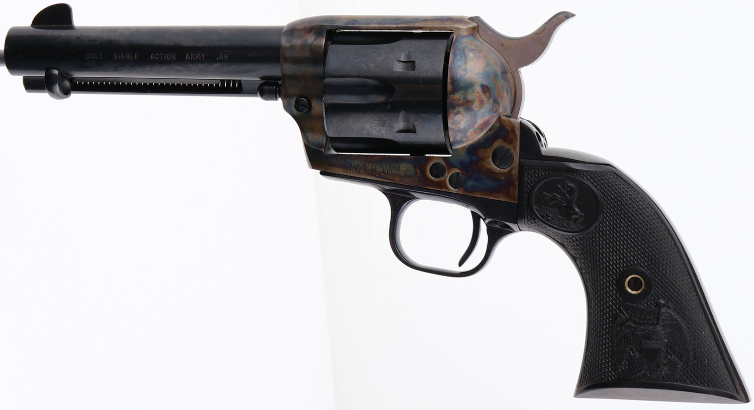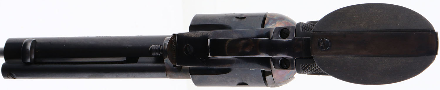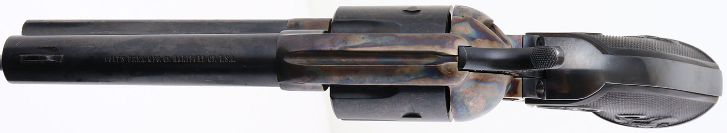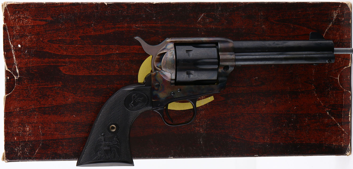 BOXED, Colt, Model Single Action Army, (P1850), CAL: 45, MFG: 1990, SN:SA64748, Single Action Revolver, 4 3/4''' barrel. This is a NEW OLD STOCK revolver with factory grease still on all surfaces & stored in its original box. The left side of barrel is stamped ''COLT SINGLE ACTION ARMY .45''. The original Eagle & Rampant Colt, checkered grips are Mint. The metal blue finish on the barrel & cylinder rates 100%. The case-hardened frame displays vivid case-colors. Bore is mint. The barrel holds a tall front blade. Comes with the Colt purchase letter from Colt President, in a Colt wood grain box, with plastic bag & paperwork. Excellent boxed Colt revolver. FFL Req. - Value: 1500 to 2500