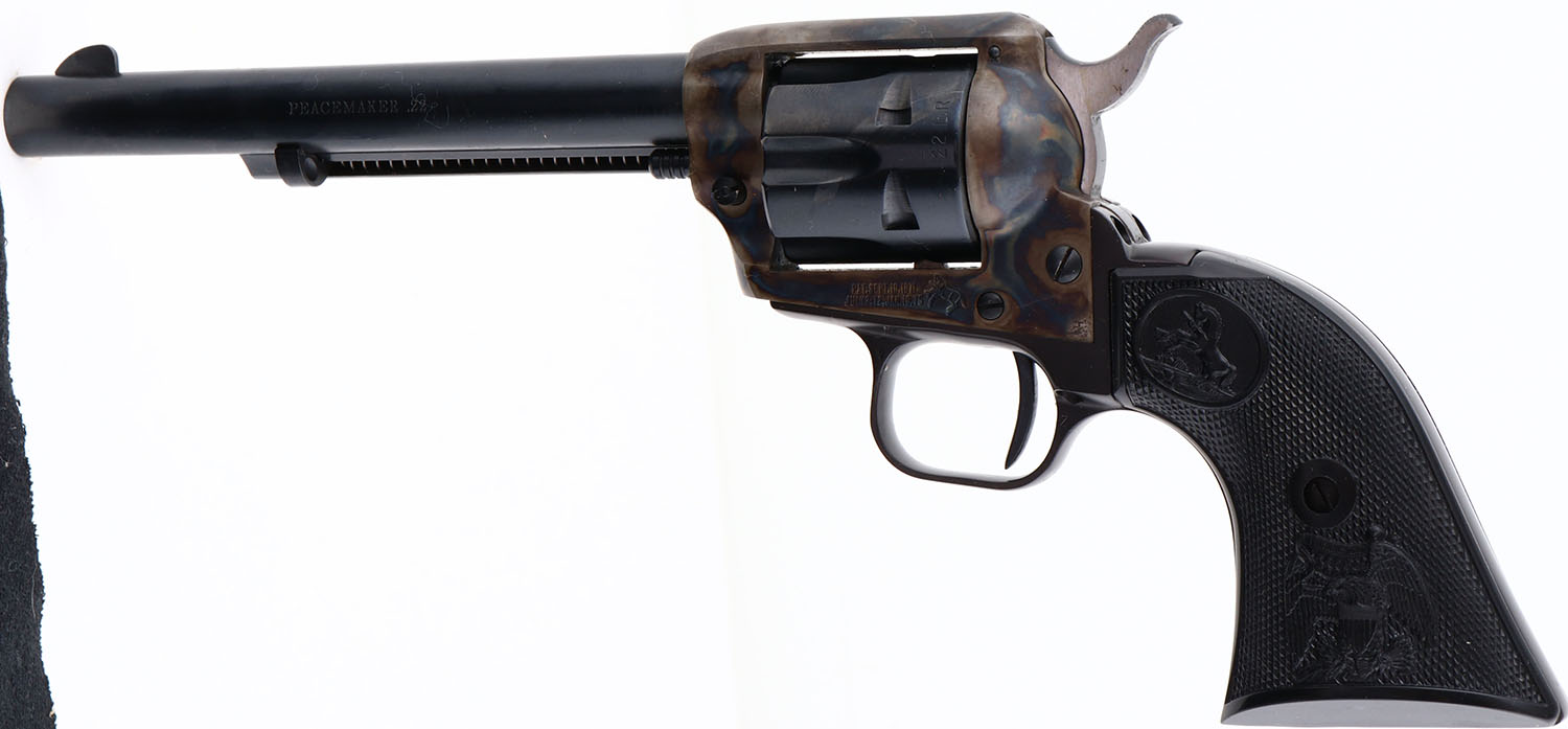 BOXED, Colt, Model PEACEMAKER, CAL: 22 LR, MFG: 1975, SN:G156765, Single Action Revolver, 6''' barrel. The left side of barrel is stamped ''PEACEMAKER .22''. The gun still carries the factory grease. The original Eagle & Rampant Colt, checkered grips are Mint. The metal blue finish on the barrel & cylinder rates 100%. The case-hardened frame displays vivid case-colors. Bore is mint. The barrel holds a front blade. Comes in a Colt wood grain box with paperwork & hang tag. A fantastic Colt Peacemaker. FFL Req. - Value: 1500 to 2500