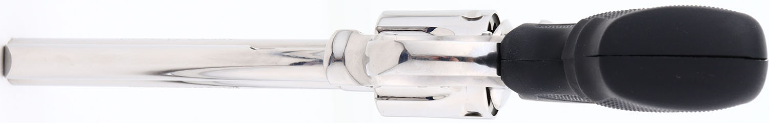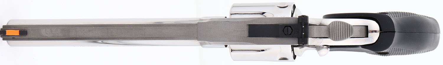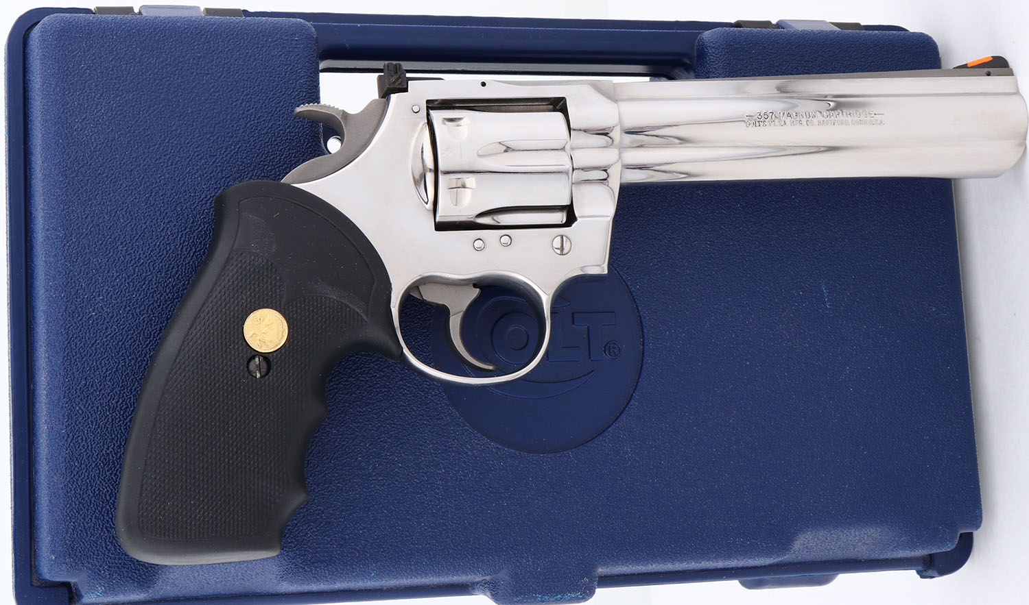 The right side ''357 MAGNUM''. They came with Colt gold medallion Pachmayr black checkered rubber grips, with finger grooves. The grips on this example are excellent. The mirror bright stainless finish is excellent. Bore is excellent. The solid rib barrel holds a screw height adjusting ''U'' notch rear sight & front blade, with the serrated orang insert. This gun comes with original blue plastic case & instruction manual. Excellent overall & highly collectible. FFL Req. - Value: 2500 to 3500