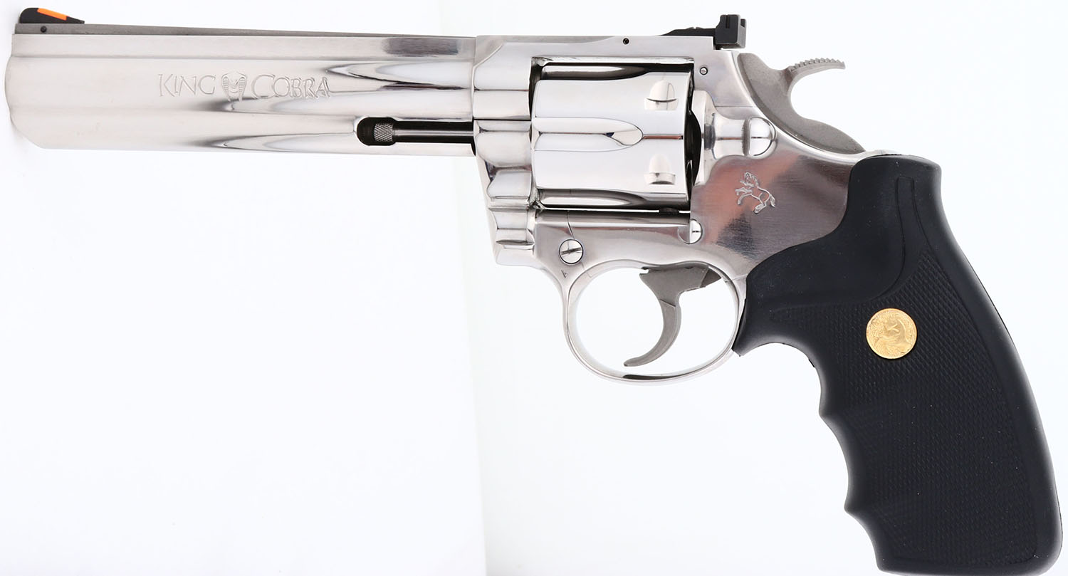 RARE CASED, Colt, Model KING COBRA, CAL: 357 MAGNUM, MFG: 1989, SN:C5904K, Double Action Revolver, 6''' barrel. First introduced in 1986, the Colt King Cobra is a medium ''V'' frame double-action revolver made of very hi-grade carbon steel & featuring a six round cylinder. The mirror bright stainless finish in both 4'' & 6'' lengths were offered from 1988-1992. It was marketed to both aw enforcement agencies & civilian firearms enthusiasts. Two subsequent offerings of this model were later produced, however collectors gravitate to the early production models, which subsequently demand a higher collector value. The left side of barrel is stamped ''KING COBRA''.