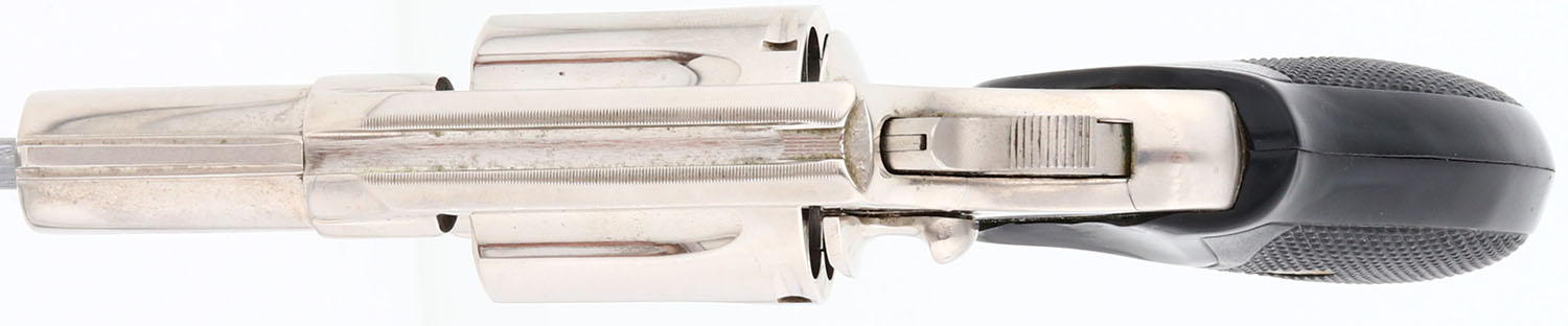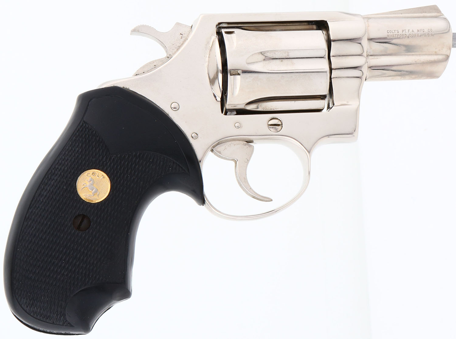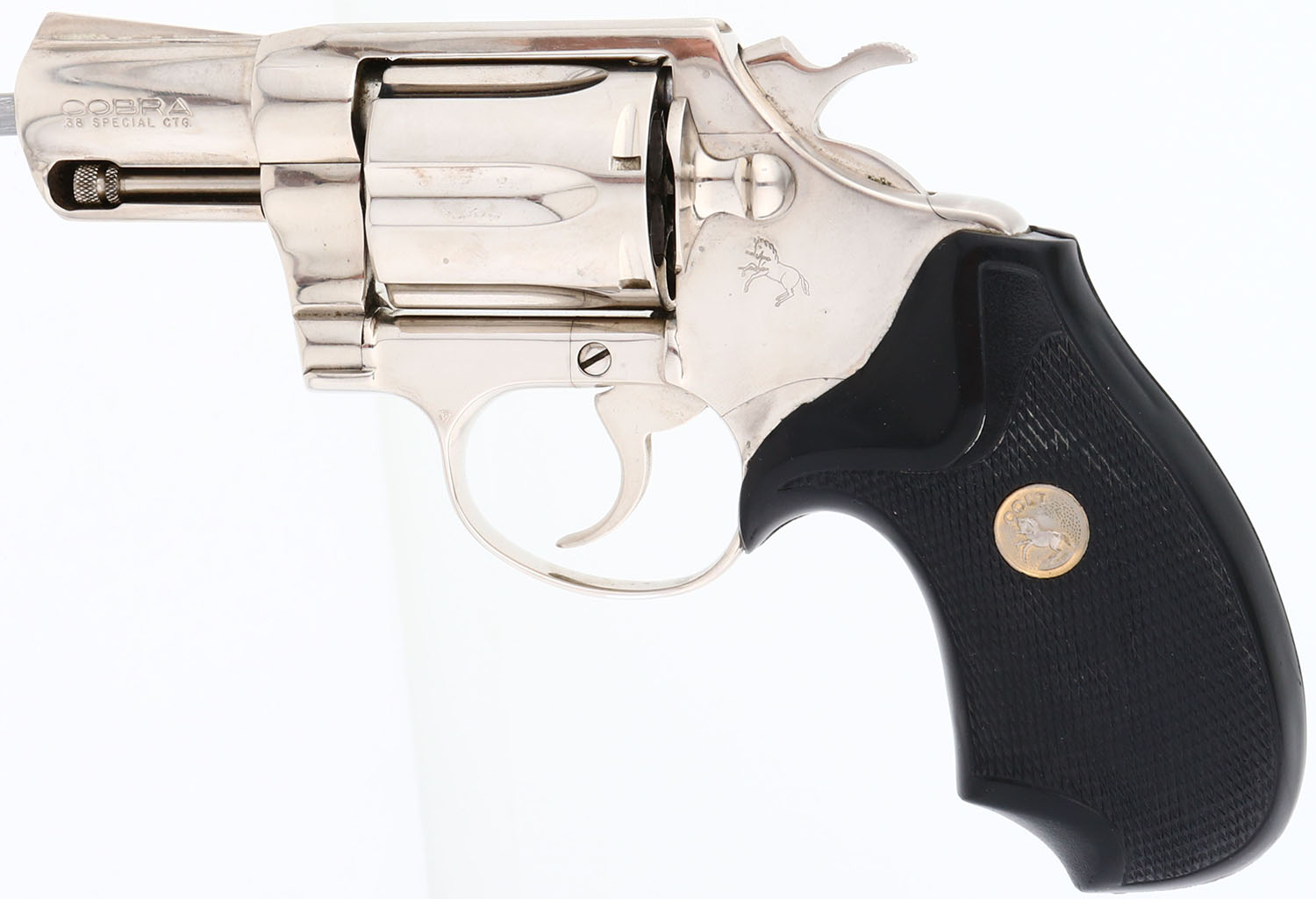 Colt, Model COBRA, (Second Issue) CAL: 38 Special, MFG: 1977, SN: 97188M, Double Action Revolver, 2'' barrel. The Colt Cobra is a lightweight, aluminum-framed, double-action short-barreled revolver. It was made in 3 models: the First Model, made from 1950-71 & weighing 15 ounces unloaded with 2'' barrel, & an improved Second Model, made from 1972-81, recognizable by its shrouded ejector rod & Baughman-style ramp front sight, with an unloaded weight of 16 ounces. The third issue debuted from 2017. The left side of barrel is stamped ''COBRA .38 SPECIAL CTG''. They came with Colt gold medallion Pachmayr black checkered rubber grips, with pinky groove. The grips on this example are very good, with a rub & wear on the lower right side front edge. The mirror bright nickel finish is excellent, but does have some haze & fine brush lines. Bore is excellent. A collectible & popular short barreled snake revolver. FFL Req. - Value: 800 to 1500
