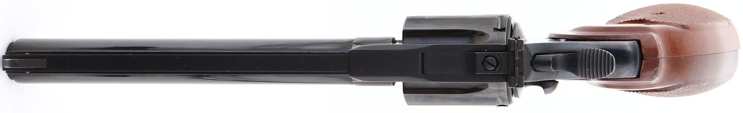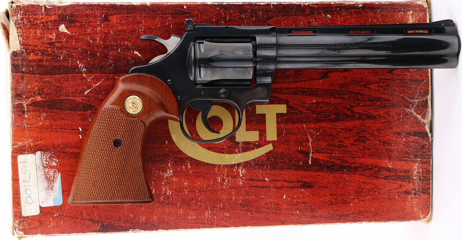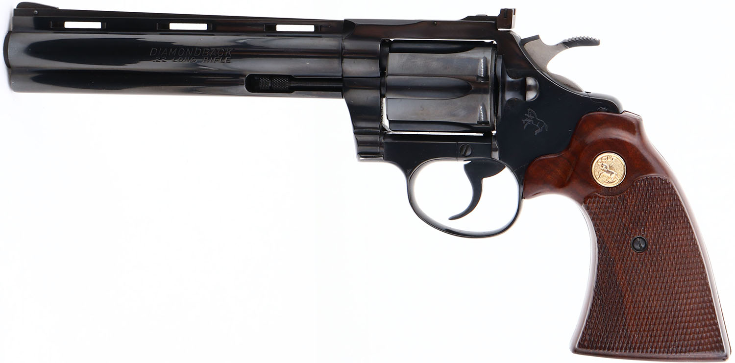 BOXED, Colt, Model Diamondback, CAL: 22 LR, MFG: 1978, SN:R18601, Double Action Revolver, 6'' barrel. The Colt Diamondback was introduced as a deluxe model in 1966, inspired by the successful Colt Python, in calibers of .22 LR, .22 WMR & .38 SPL. The Diamondback is built on the smaller ''D frame'', same as used in the Detective Special. It has a 6-shot swing-out cylinder & was available in blue or nickel finishes. It has a wide serrated target hammer, ventilated rib, fully adjustable target quality sights, & full-length barrel underlug. The left side of barrel is stamped ''DIAMONDBACK .22 LONG RIFLE''. They came with Gold tone Colt medallions in the checkered Walnut grips. The grips on this example are near mint, with a small edge rub on the front bottom & a couple of tiny contusions. The high polish blued finish is Likewise near mint. Bore is near mint. The satin finished top of the ventilated rib barrel holds a screw height adjusting ''U'' notch rear sight & front blade sight. This gun comes in the Colt wood grain box, with 5 different original pamphlets or booklets. Nearly NOS. Very collectible Diamondback. FFL Req. - Value: 1500 to 2500