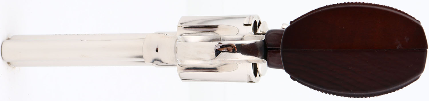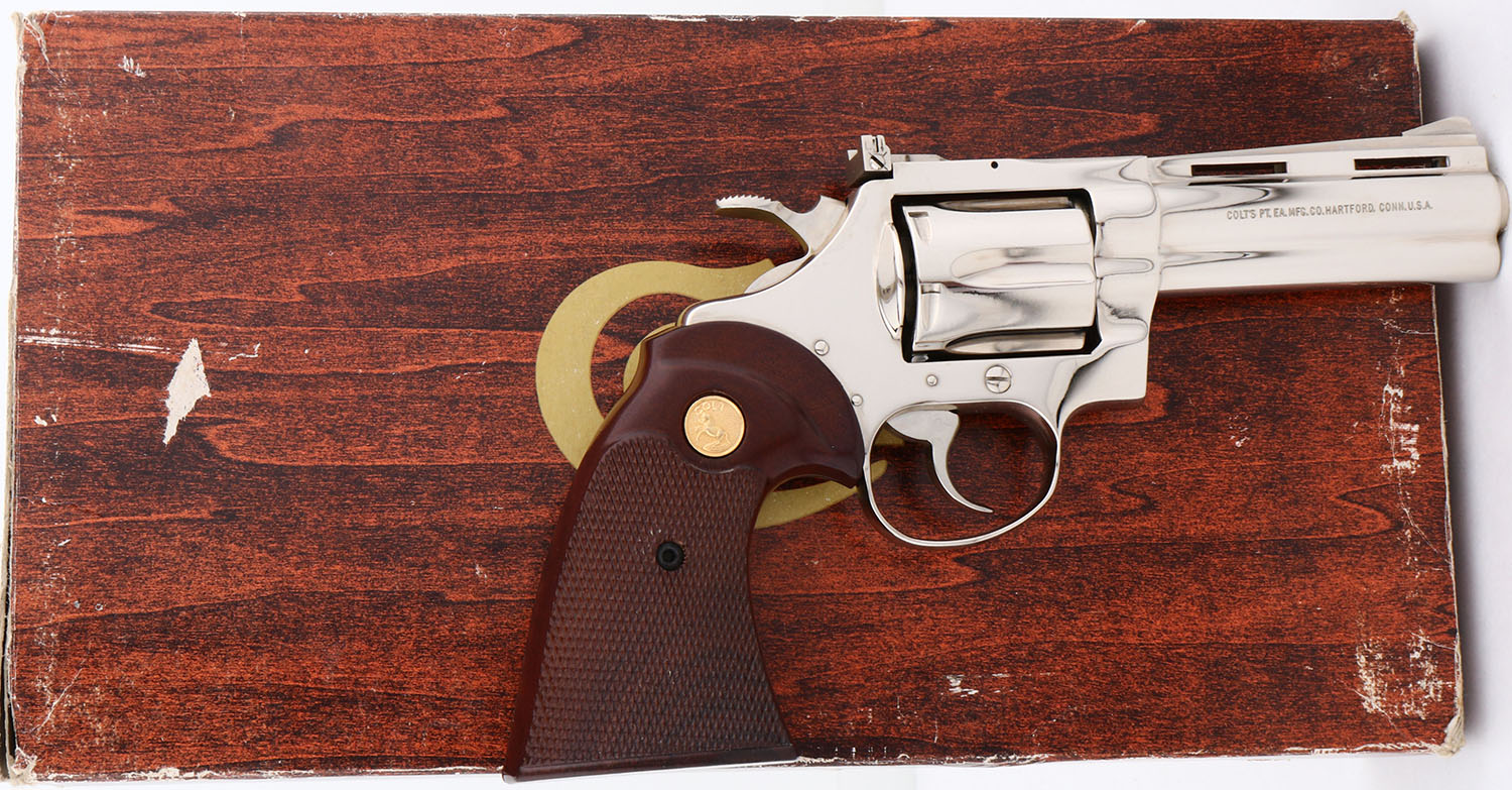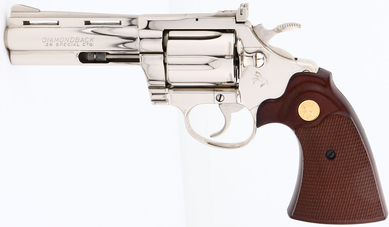 BOXED, Colt, Model Diamondback, (D5541) CAL: .38 SPL, MFG: 1978, SN: R06925, Double Action Revolver, 4'' barrel. The Colt Diamondback was introduced as a deluxe model in 1966, inspired by the successful Colt Python, in calibers of .22 LR, .22 WMR & .38 SPL. The Diamondback is built on the smaller ''D frame'', same as used in the Detective Special. It has a 6-shot swing-out cylinder & was available in blue or nickel finishes. Nickeled variations in the .38 like this one command 20% collectors premiums. It has a wide serrated target hammer, ventilated rib, fully adjustable target quality sights, & full-length barrel underlug. The left side of barrel is stamped ''DIAMONDBACK .38 SPECIAL CTG''. The Rampant Colt gold medallion, checkered walnut grips on this example are near mint. The high polish nickeled finish is mint. Bore is mint. The matte finished top of the ventilated rib barrel holds a screw height adjusting ''U'' notch rear sight & front blade sight. This gun comes in its original Colt wood grain box, with instruction manuals, hang tag, screw driver tool coin, bag wrapping. Highly collectible in this condition & desirable in nickeled variation. FFL Req. - Value: 2000 to 2500