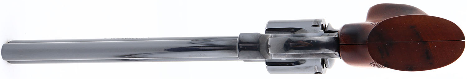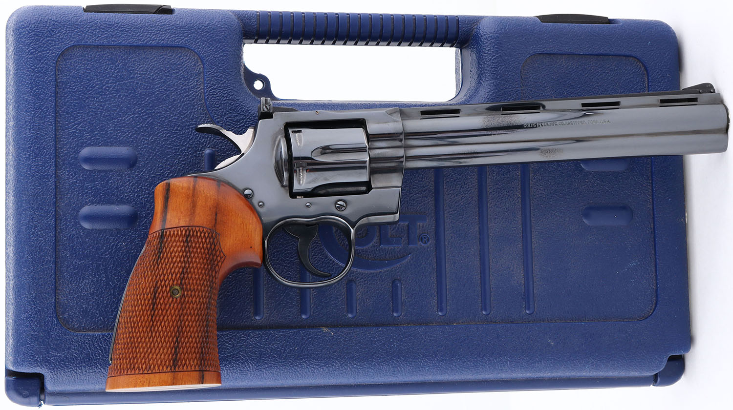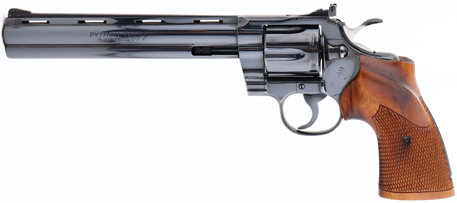 SCARCE BOXED, Colt, Model Python TARGET, CAL: .38 SPL-, MFG: 1980, SN: VA9049, Double Action Revolver, 8'' barrel. In 1980 Colt produced 3,740 Phyton Target models with 8'' barrels in .38 SPL. Of those produced 3,489 were blued & only 251 nickeled. The Colt Python was introduced as a premium model in 1955, in caliber .357 Magnum, with some rare caliber variations produced along the way. The Python is built on the large I-frame & has a reputation for accuracy, smooth trigger pull, & a tight cylinder lock-up. It has a 6-shot swing-out cylinder & was available in Python blue, Royal blue, Python nickel & Python stainless steel finishes. Some firearm collectors & writers have described the Python as ''the finest production revolver ever made''. It has a wide serrated target hammer, ventilated rib, & fully adjustable target quality rear sights. The left side of barrel is stamped ''PYTHON TARGET * .38 SPECIAL CTG * ''. The custom order thumb target grips are excellent, with crisp checkering, near mint. The metal blue finish is minty. Bore is mint. The satin finished top of the ventilated rib barrel holds a screw height adjusting ''U'' notch rear sight & black serrated blade front sight. This gun comes in a blue Colt hard case, with owners manual. FFL Req. - Value: 3000 to 4000