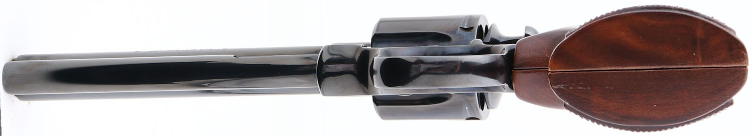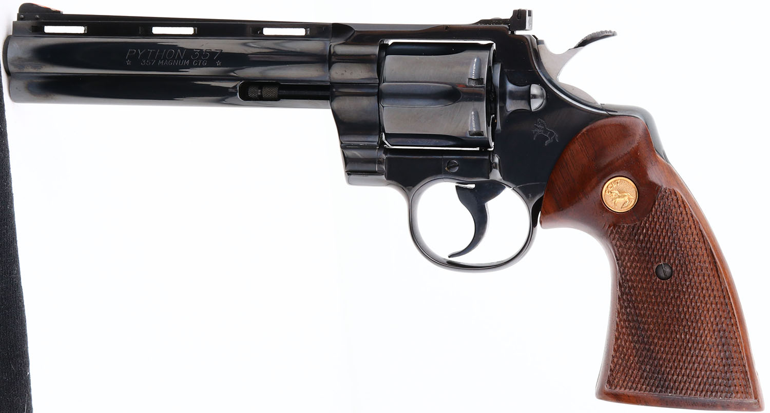 BOXED, Colt, Model Python, (I3660) CAL: .357 Magnum, MFG: 1975, SN: 11815E, Double Action Revolver, 6'' barrel. The Colt Python was introduced as a premium model in 1955, in caliber .357 Magnum. The Python is built on the large I-frame & has a reputation for accuracy, smooth trigger pull, & a tight cylinder lock-up. It has a 6-shot swing-out cylinder & was available in Python blue, Royal blue, Python nickel & Python stainless steel finishes. Some firearm collectors & writers have described the Python as ''the finest production revolver ever made''. It has a wide serrated target hammer, ventilated rib, & fully adjustable target quality rear sights. The left side of barrel is stamped ''PYTHON 357 * .357 MAGNUM CTG * ''. The Rampant Colt gold medallion, checkered walnut grips on this example are mint. The high polish blued finish is near mint. Bore is mint. The satin finished top of the ventilated rib barrel holds a screw height adjusting ''U'' notch rear sight & front blade sight. This gun comes in its original Colt wood grain box, with instruction manuals, hang tag, & screw driver tool coin. Consignor is the original purchaser & claims the revolver was never shot outside the factory test. Basically NOS, & very collectible when found in this condition. FFL Req. - Value: 2500 to 3000