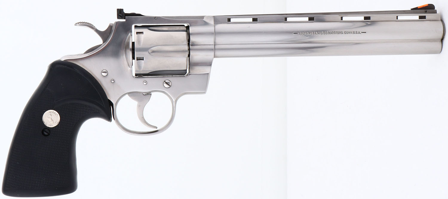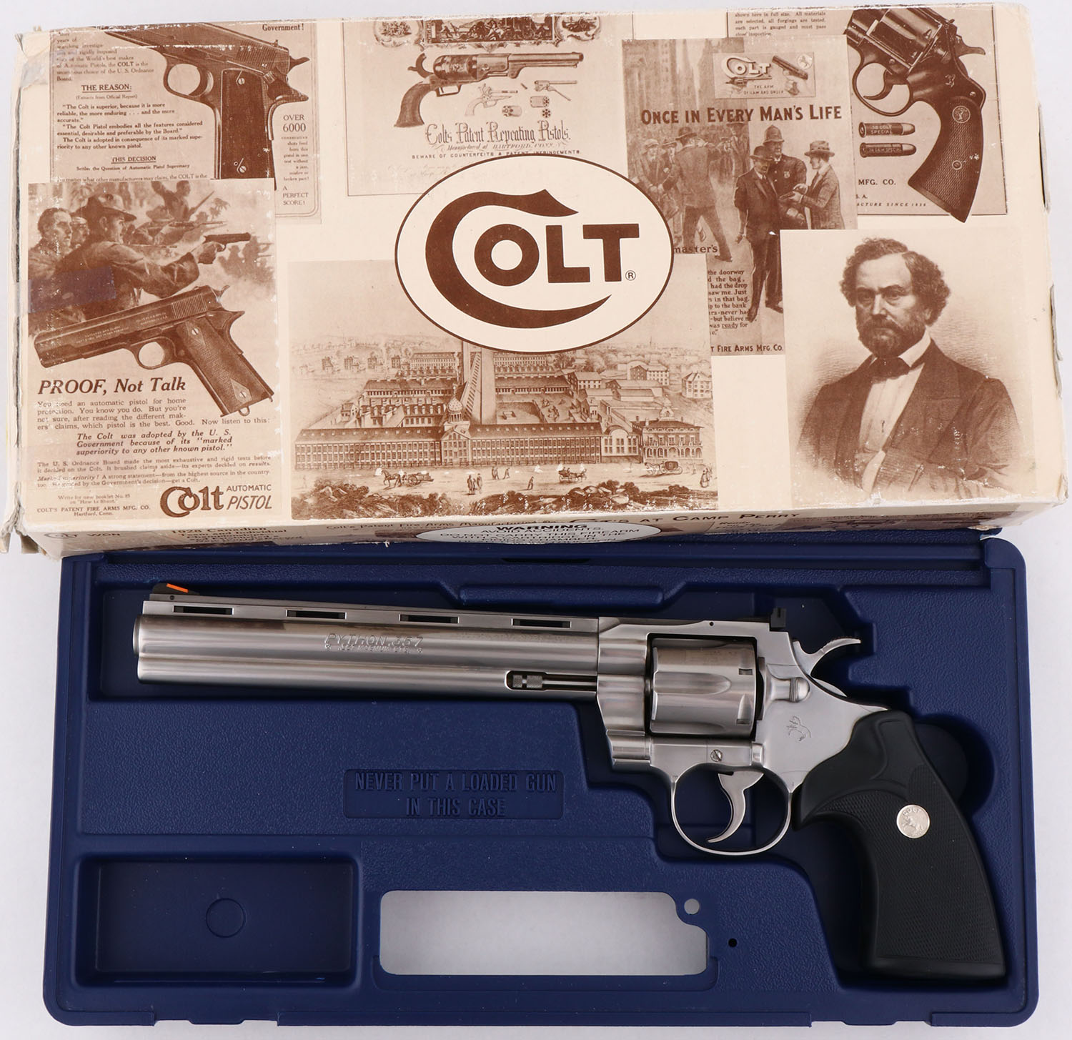 NEW CASED, Colt, Model Python, (I3080) CAL: .357 Magnum, MFG: 1994, SN: PY8670, Double Action Revolver, 2 1/2'' barrel. The Colt Python was introduced as a premium model in 1955, in caliber .357 Magnum. The Python is built on the large I-frame & has a reputation for accuracy, smooth trigger pull, & a tight cylinder lock-up. It has a 6-shot swing-out cylinder & was available in Python blue, Royal blue, Python nickel & Python stainless steel finishes. Some firearm collectors & writers have described the Python as ''the finest production revolver ever made''. It has a wide serrated target hammer, ventilated rib, & fully adjustable target quality rear sights. The left side of barrel is stamped ''PYTHON 357 .357 MAGNUM CTG ''. The Rampant Colt silver medallion, checkered rubber grips on this example are mint. The stainless steel finish is near mint. Bore is mint. The satin finished top of the ventilated rib barrel holds a screw height adjusting ''U'' notch rear sight & front blade sight, with orange insert. This gun comes in its original Colt blue case, with cardboard outer picture box & instruction manual, pamphlets & hanging tag. Consignor's note claims the revolver was never shot outside the factory test. Basically NOS, & very collectible & desirable in the rarer 8'' stainless variation. FFL Req. - Value: 2500 to 3500