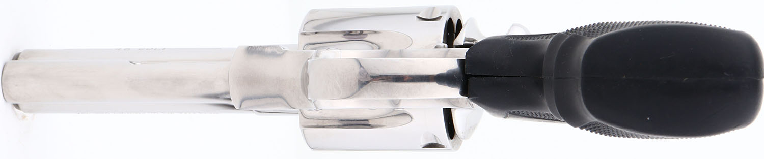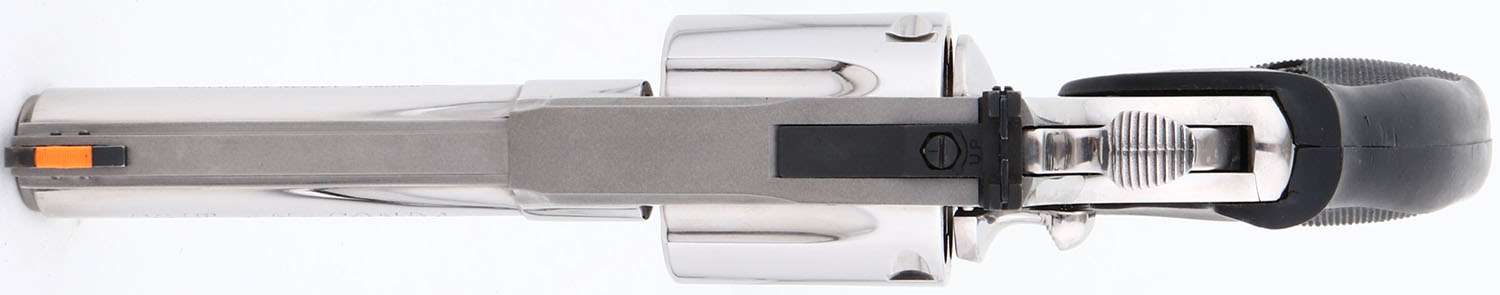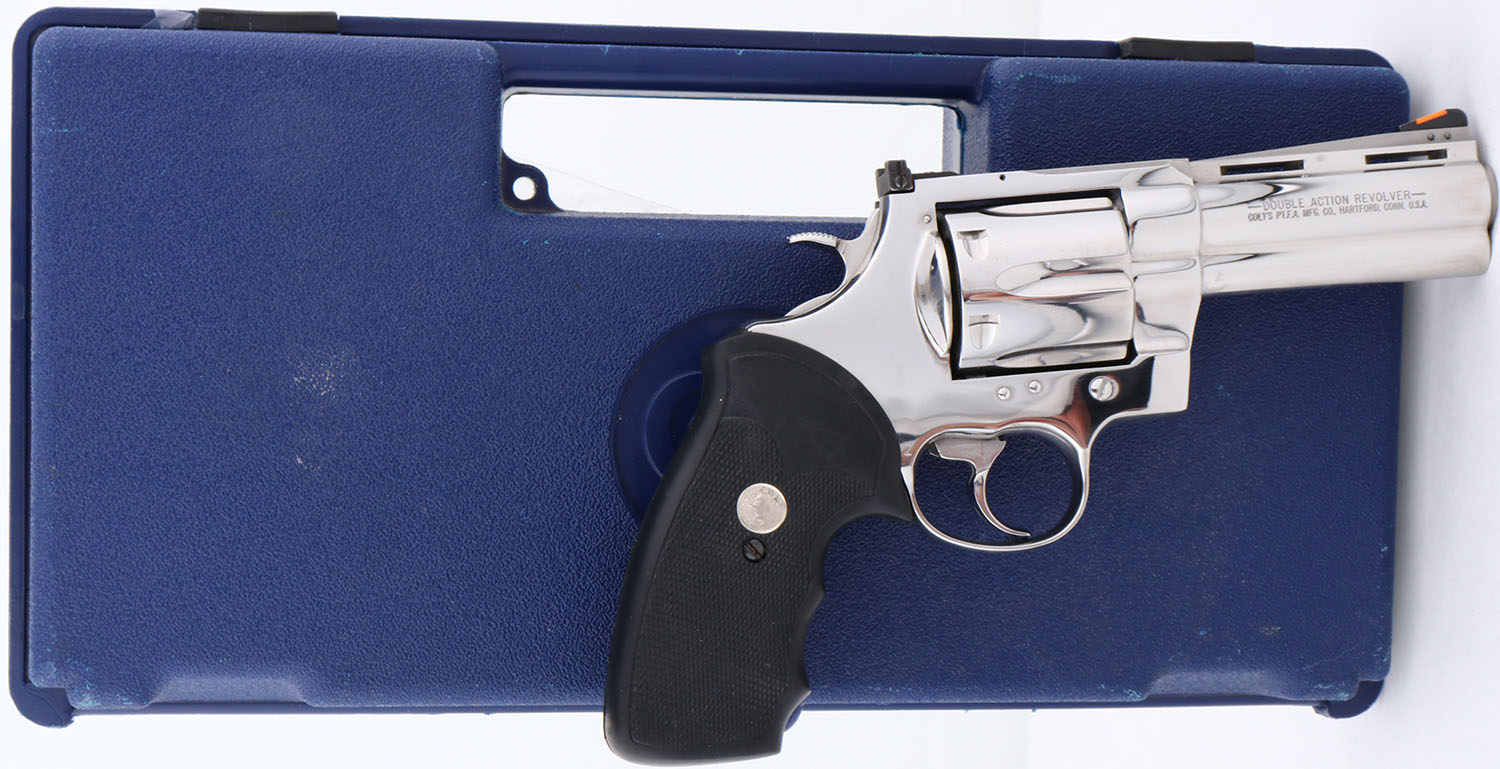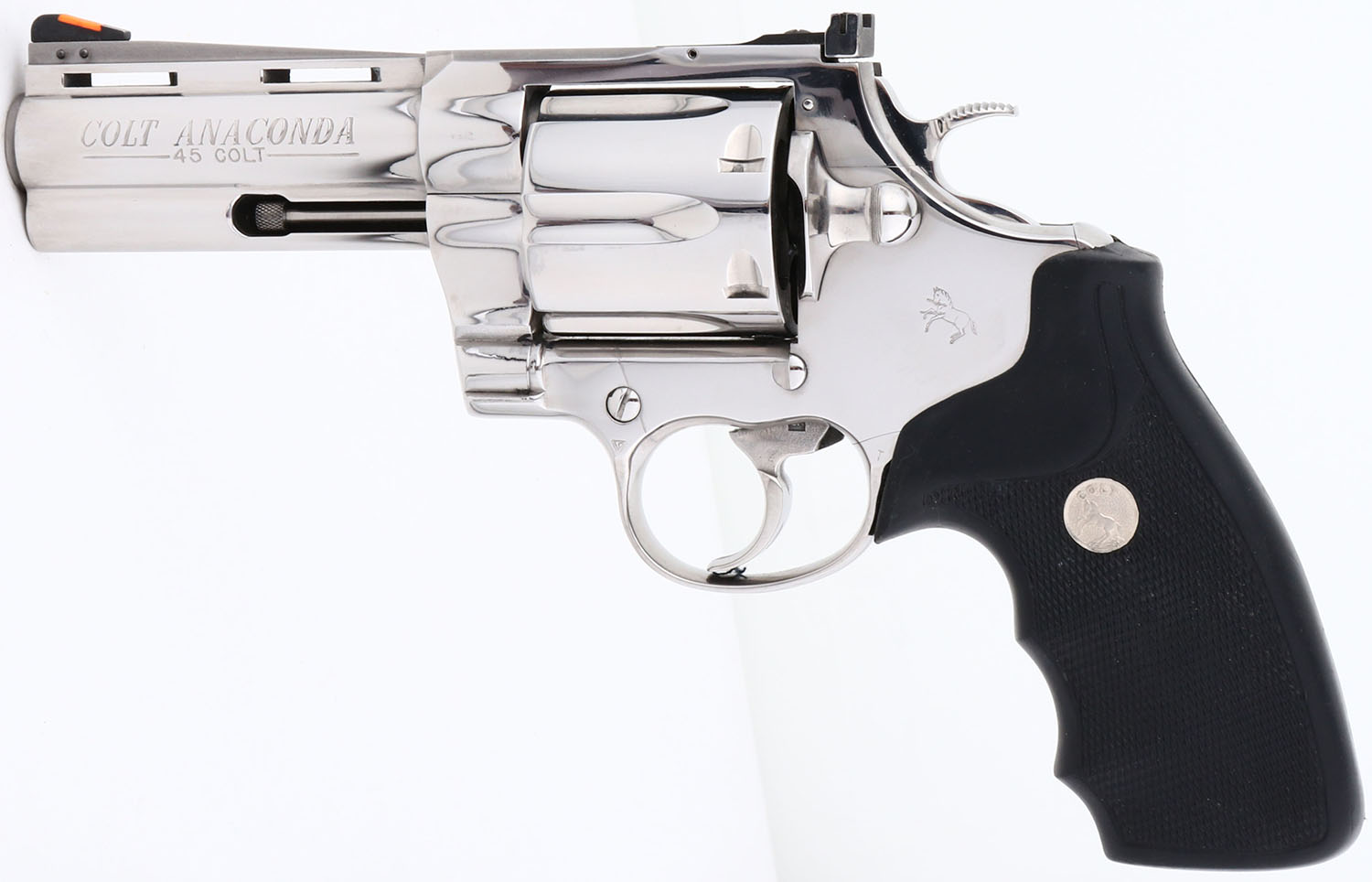 CASED, Colt, Anaconda, CAL: .45 COLT, MFG: 1996, SN: MM53913, Double Action Revolver, 4'' barrel. The Colt Anaconda was introduced in 1990, in caliber 44 Mag & 45 Colt to compete in the popular large-bore Magnum pistol market. The Anaconda was built on the new & heavier large ''MM''-frame & was only produced in stainless steel, with different finishes available. This example is more desired by collectors with the 4'' barrel & also being chambered in .45 COLT, which brings an additional 20% premium according to the Blue Book. The left side of barrel is stamped ''COLT ANACONDA -- 45 COLT -- ''. The silver Colt medallion textured rubber grips are excellent. The polished stainless steel finish is excellent & minty. Bore is excellent. The frame holds a white outline ''U'' notch rear sight & front blade sight, with orange insert. This gun comes in an original Colt blue plastic case. FFL Req. - Value: 2500 to 4500
