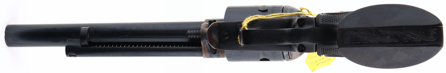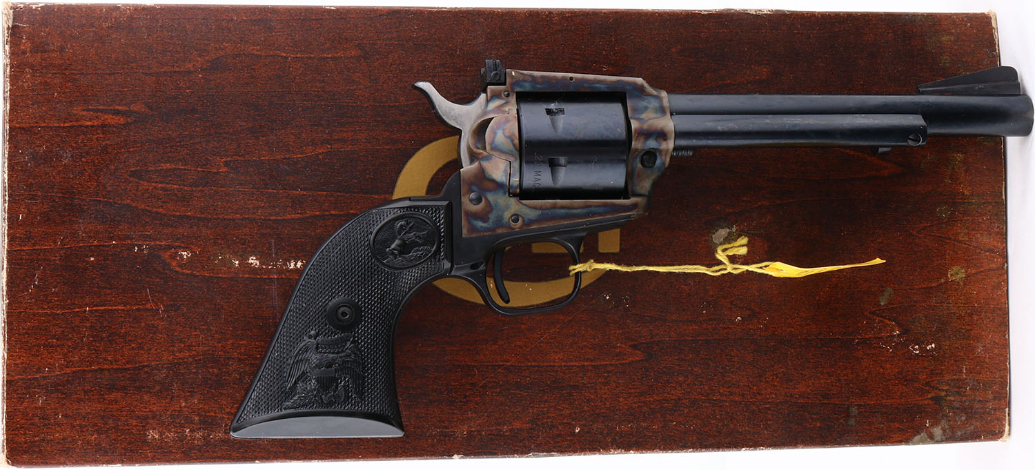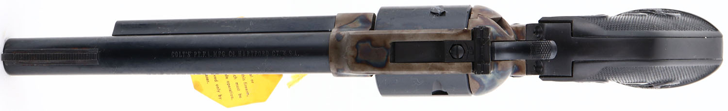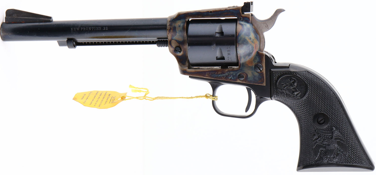 BOXED, Colt, New Frontier .22 Dual Cylinder ''G2461'', CAL: 22 MAG/ 22LR, MFG: 1976, SN: G184416, Single Action Revolver, 6'' barrel. This variation features similar features to the Peacemaker 22, but has a flat-top frame, ramp front & adjustable rear sight. The top of the barrel is marked ''COLTS PT. F.A. MFG. Co. HARTFORD, CT. U.S.A.'', the left side is marked ''NEW FRONTIER .22'', the right side of the frame is marked with a two line patent date, ahead of the Rampant Colt logo. The Colt logo & American Seal checkered plastic grips are excellent. The metal blue finish on the barrel, cylinder & trigger guard rates 99%+ & the frame is case-hardened, retaining full case-colors. This gun has the original factory grease on it. Bore is excellent. Factory sights. Comes in correct SN matching box, with all paperwork, 3 prong disc tool & 22LR cylinder. Original hang tag. FFL Req. - Value: 600 to 1200