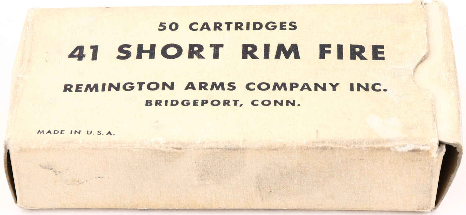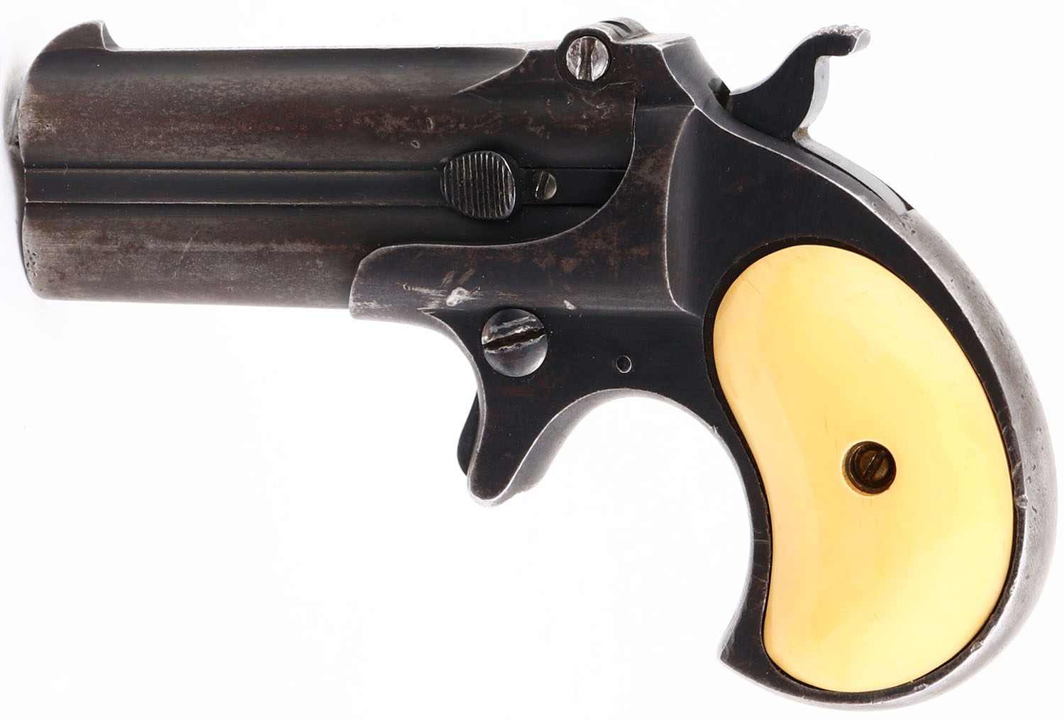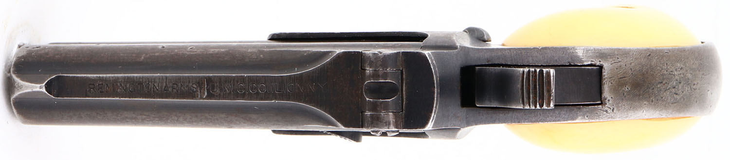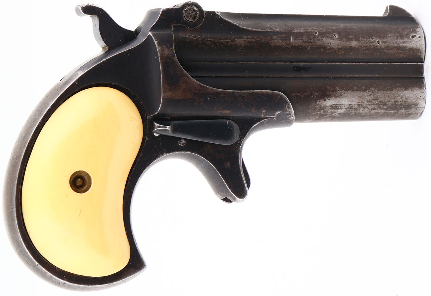 Remington, Model 95 Double Derringer, 3rd variation, CAL:.41 Rim Fire, O/U Pistol, MFG: 1912-1935, SN: 196242, 3'' barrels. The top of the barrel is stamped ''REMINGTON ARMS UMC CO. ILION NY''. The faux Ivory grips are excellent but yellowed. The metal blue finish rates 50%. Bore is very good. The 3rd Model Derringers have no vents between the barrels with only 500 ever made & the rarest of the 3rd models. Comes with a partial box (8rds). FFL or C&R Req. - Value: 200 to 600