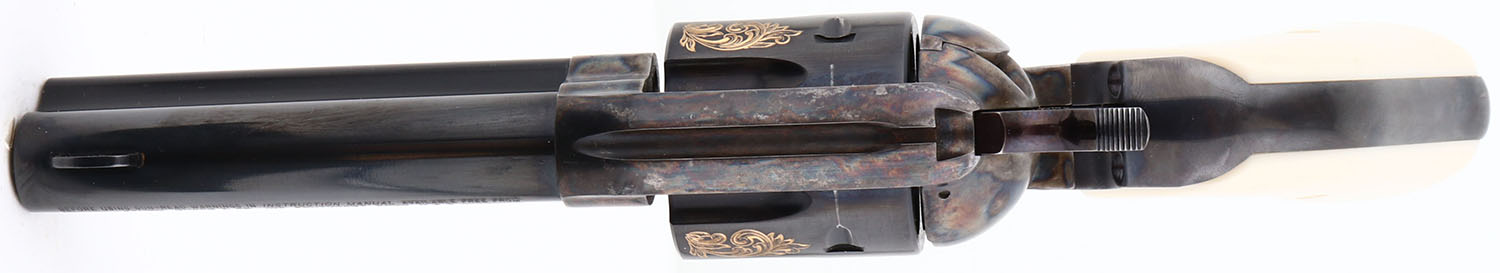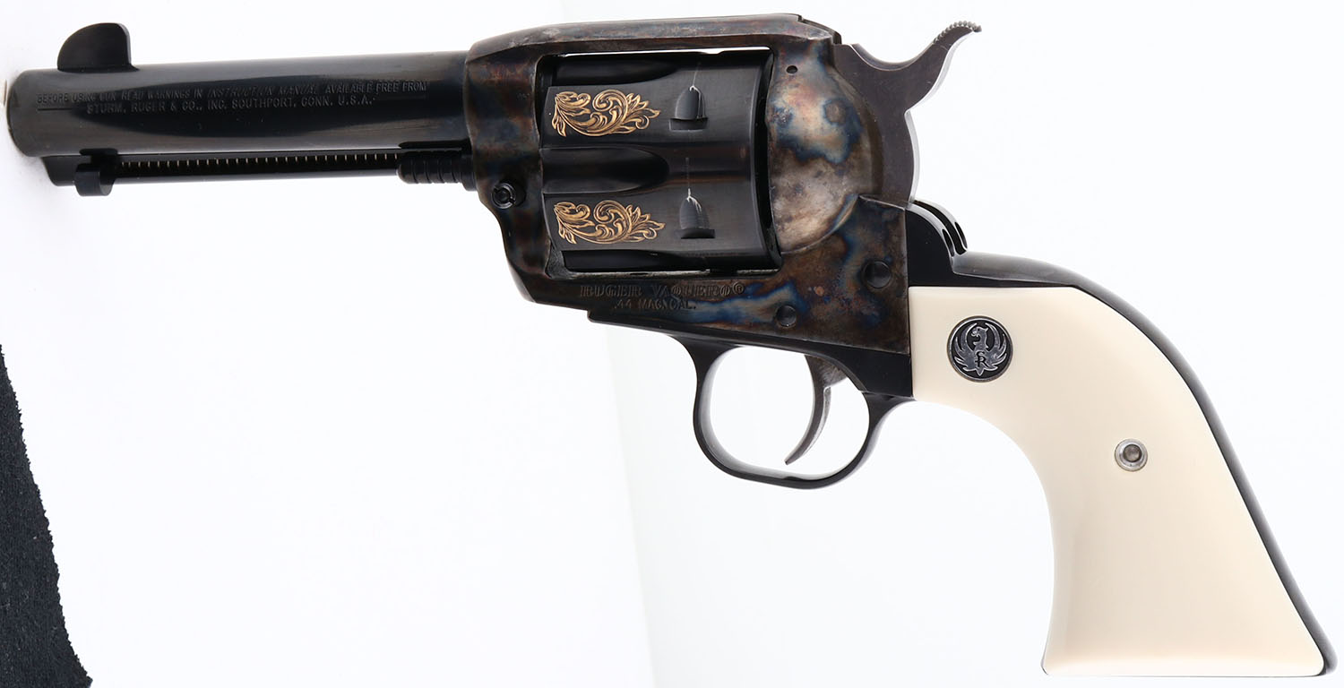 NEW, CASED, Ruger, Vaquero, CAL: 44 MAG, MFG: 1999, SN: 56-77268, Single Action Revolver, 4 5/8'' barrel. The Ruger logo faux ivory grips are excellent. The metal blue finish on the barrel, cylinder & trigger guard is excellent. The frame is case-hardened, retaining full case-colors. The floral engraving on the cylinder is gold tone, crisp & full. Bore is excellent. Barrel holds single front blade. Comes in original Ruger grey hard case, with owners manual, paperwork, lock & key. NOS. FFL Req. - Value: 700 to 1400