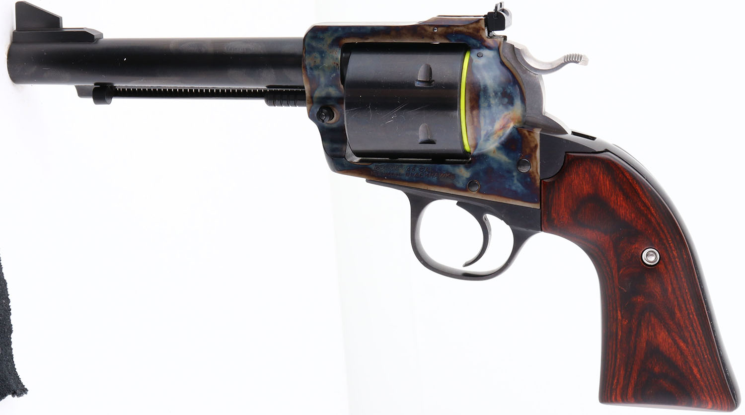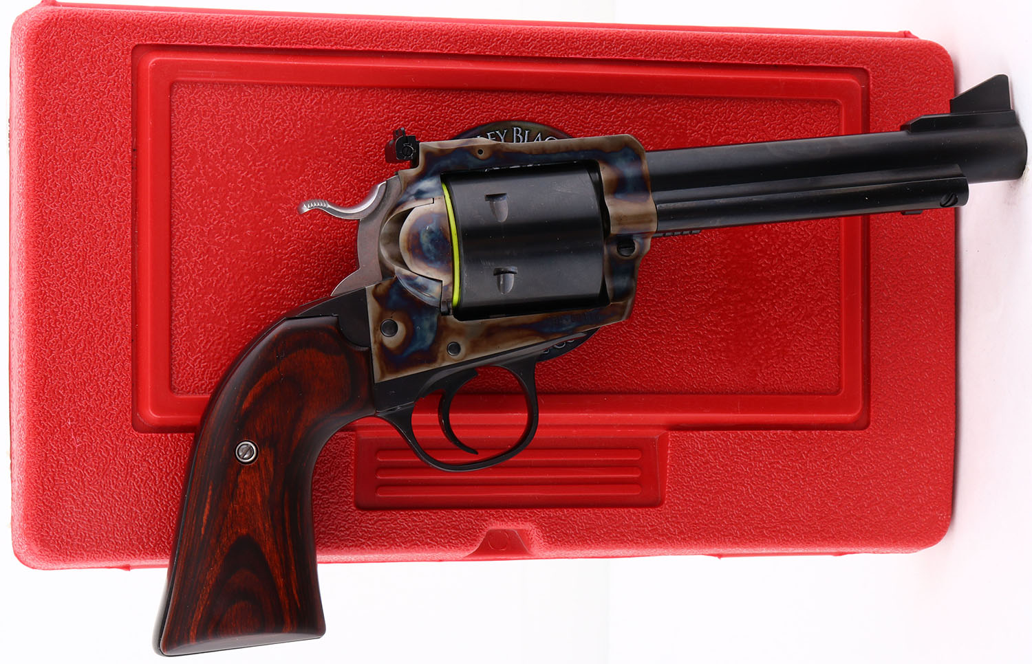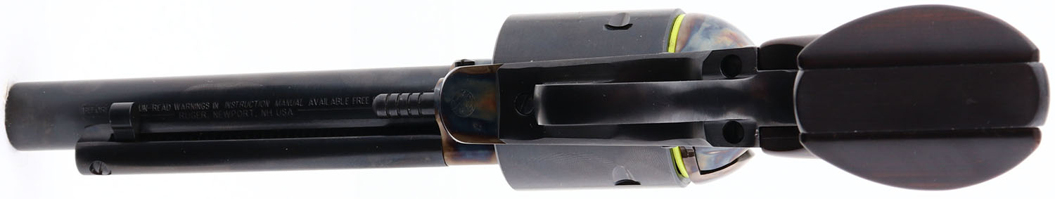 NEW, CASED, Ruger, New Model Blackhawk, Turnbull Bisley Blackhawk, One of 500, CAL: 45LC, MFG: 2017, SN: TBB-00114, Single Action Revolver, 5 1/2'' barrel. The wood grips are excellent. The metal blue finish on the barrel, cylinder & trigger guard rates 98% overall, scuffs on the cylinder. The frame is case-hardened, retaining full case-colors. Turnbull logo on bottom of frame head of trigger guard. Bore is excellent. Factory sights. Comes in original red hard case, with packaging, owners manual, lock & key. NOS. FFL Req. - Value: 800 to 1400