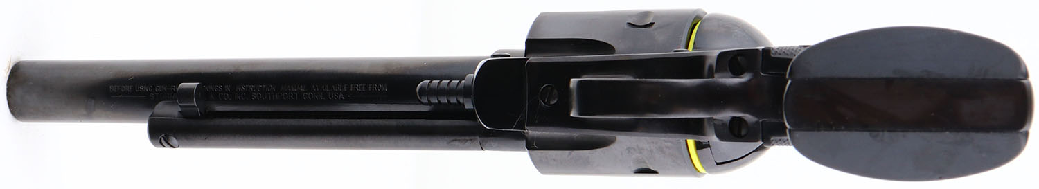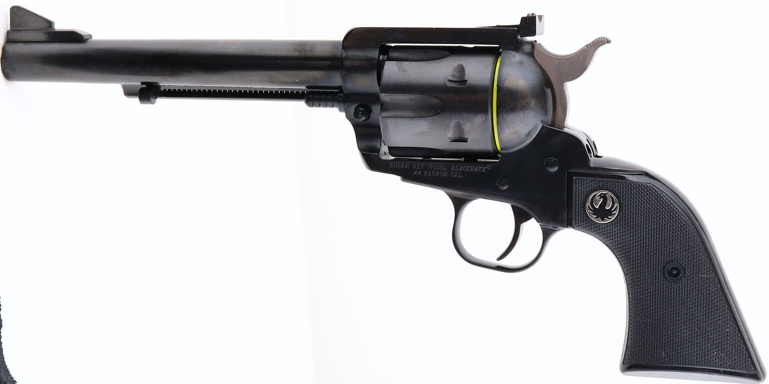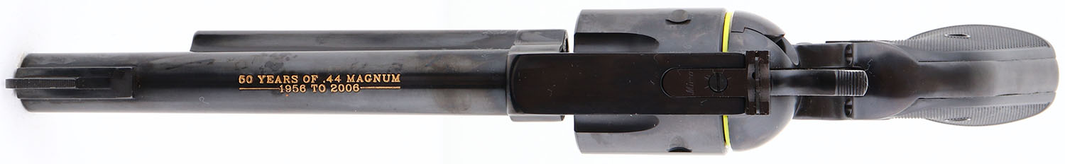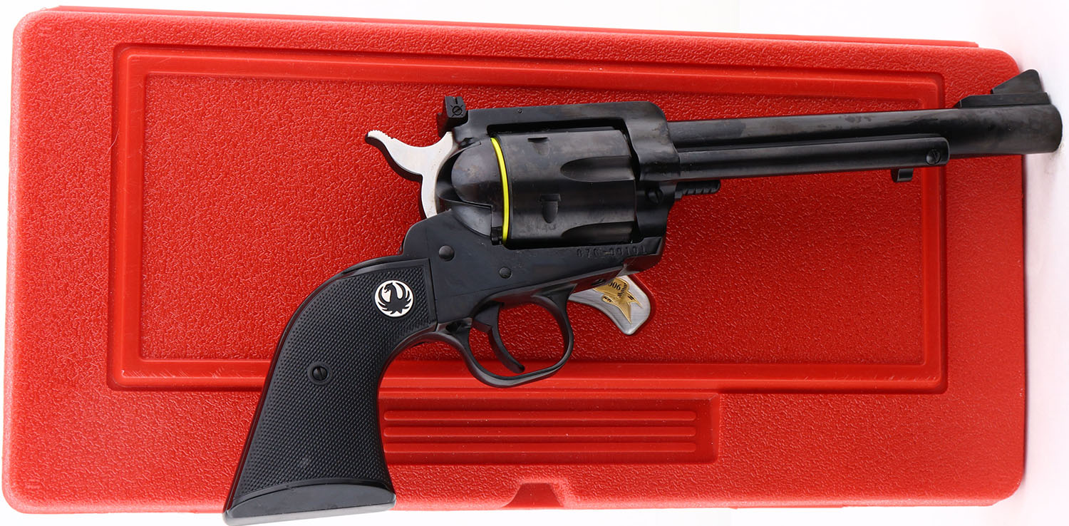 NEW, CASED, Ruger, New Model Blackhawk, 50th Anniversary .44 Magnum, CAL: 44MAG, MFG: 2006, SN: 870-00101, Single Action Revolver, 6 1/2'' barrel. The Ruger logo medallion checkered plastic grips are excellent. The metal blue finish rates 99%+ overall, with factory grease still on gun. Bore is unfired outside factory test. Factory sights. Comes in original red hard case, with packaging, owners manual, test fire cartridge, lock & key. NOS. FFL Req. - Value: 500 to 1000