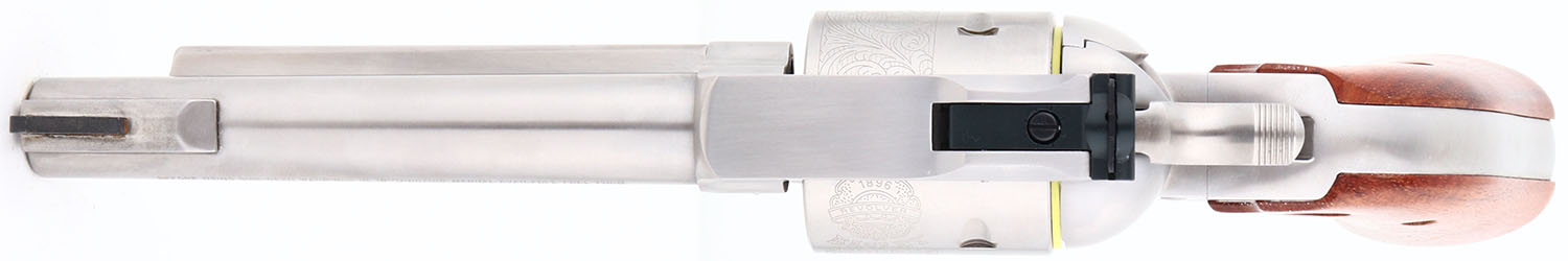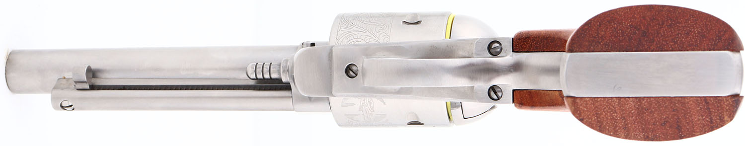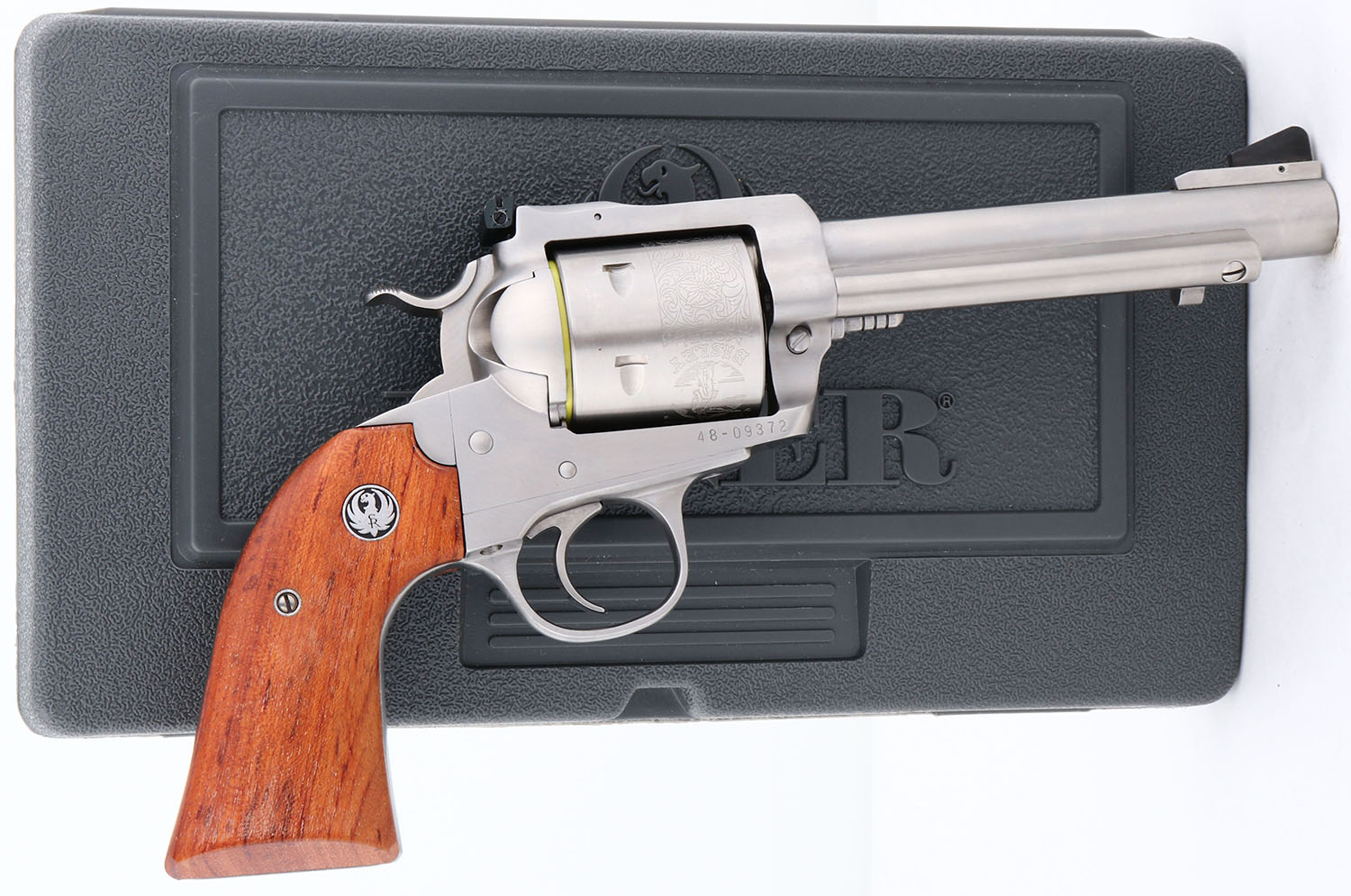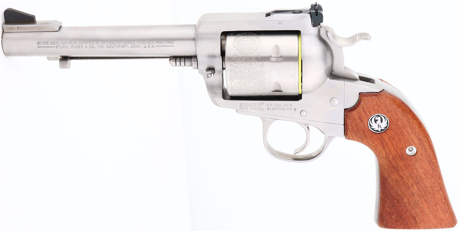 NEW, CASED, Ruger, New Model Blackhawk, CAL: 45 COLT, MFG: 2001, SN: 48-09372, Single Action Revolver, 4 3/4'' barrel. The Ruger logo medallion wood grips are excellent & minty. The polished stainless steel finish is excellent & mint. Bore is excellent, near mint. Ruger Bisley Model floral roll stamped cylinder. Factory sights. Comes in original box with owners manual, paperwork, test fire cartridge, lock & key. NOS. FFL Req. - Value: 500 to 1000