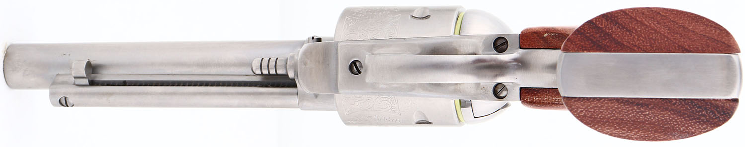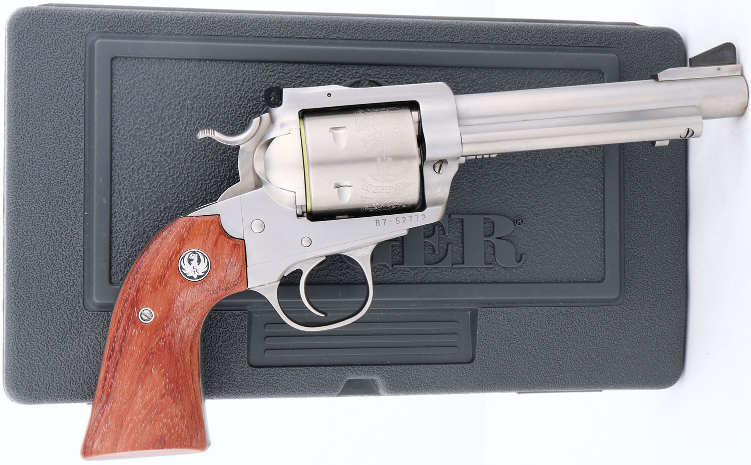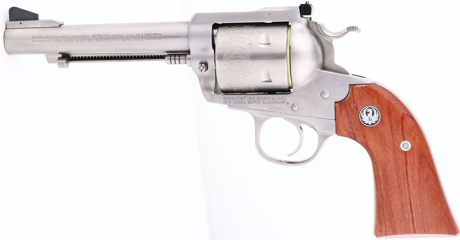 NEW, CASED, Ruger, New Model Super Blackhawk, CAL: 44 MAG, MFG: 2002, SN: 87-52772, Single Action Revolver, 4 3/4'' barrel. The Ruger logo medallion wood grips are excellent & minty. The polished stainless steel finish is excellent & mint. Bore is mint. Ruger Bisley Model floral roll stamped cylinder. Factory sights. Comes in original box with owners manual, paperwork, test fire cartridge, lock & key. NOS. FFL Req. - Value: 500 to 1000