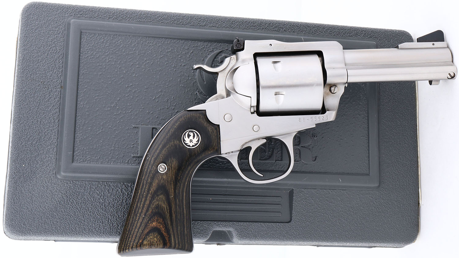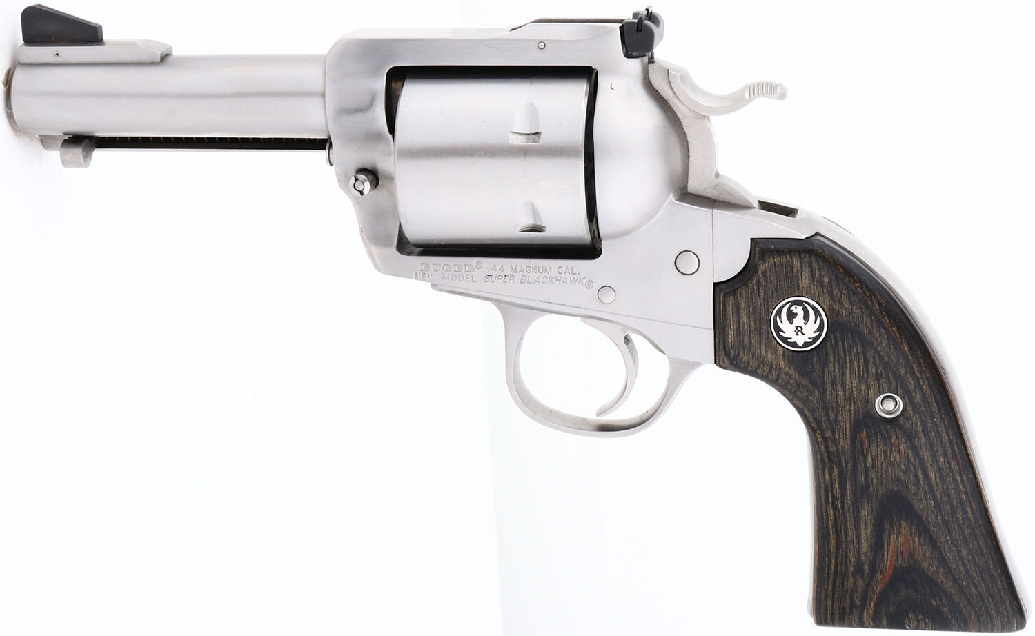 NEW, CASED, Ruger, Super Blackhawk, CAL: 44 MAG, MFG: 2013, SN: 88-55523, Single Action Revolver, 3 3/4'' barrel. The Ruger logo medallion wood grips are excellent & minty. The polished stainless steel finish is excellent & minty. Bore is mint. Factory sights. Comes in original hard case, with owners manual, paperwork, test fire cartridge, lock & key. NOS. FFL Req. - Value: 1000 to 2000