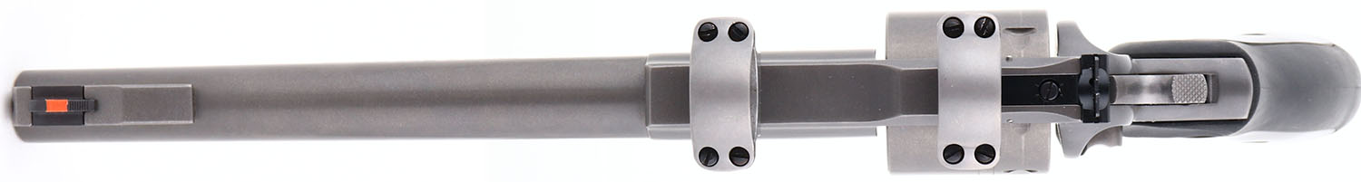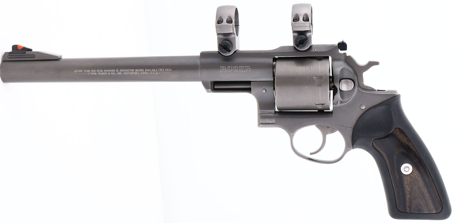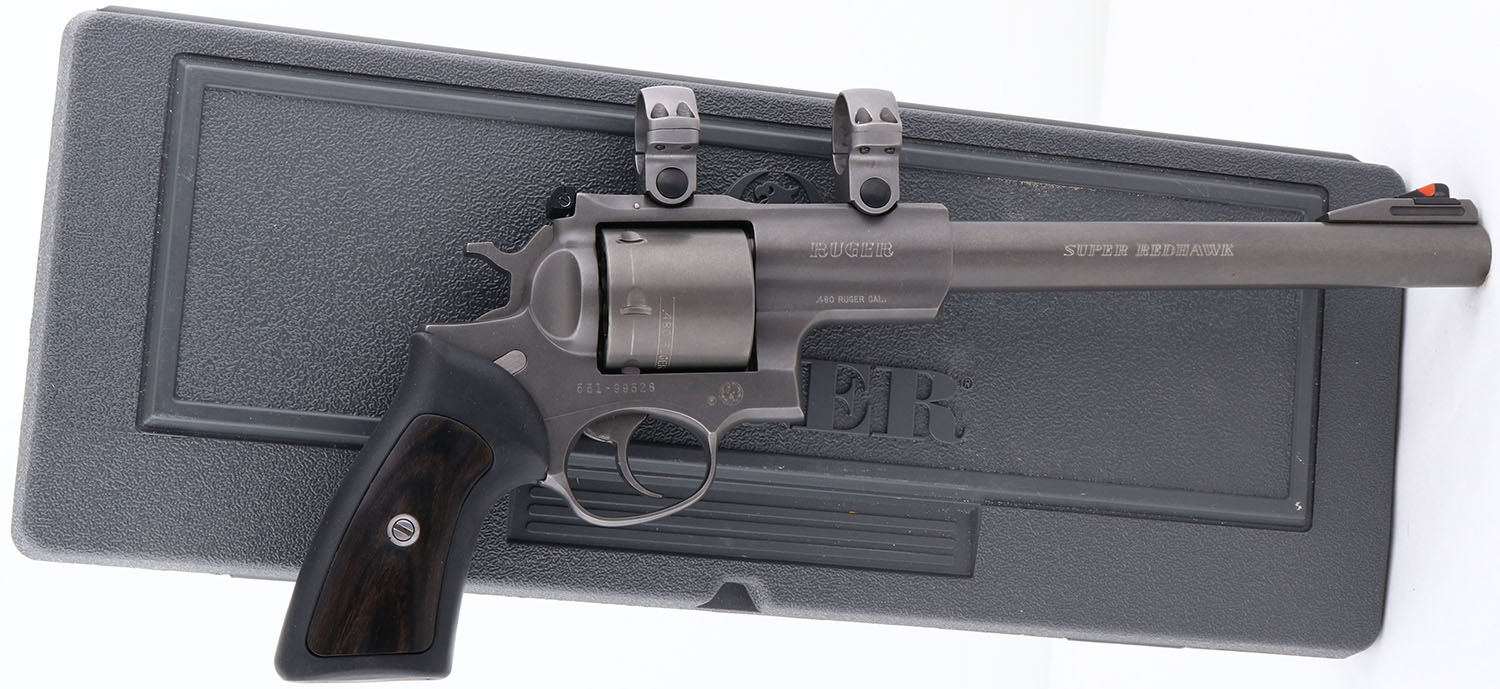 CASED, Ruger, Super Redhawk, CAL: .480 Ruger, MFG: 2001, SN: 551-99528, Double Action Revolver, 9 1/2'' barrel. The original wood & rubber grips are excellent. The matte grey finish rates 99%+. Bore is excellent & minty. Factory sights. Frame has integrated scope ring mounts. Comes in original box, with owners manual, test fire cartridge, scope rings, lock & key. The scope for this gun is in our Miscellaneous section, to view the scope, visit Lot # 90563. FFL Req. - Value: 800 to 1600
