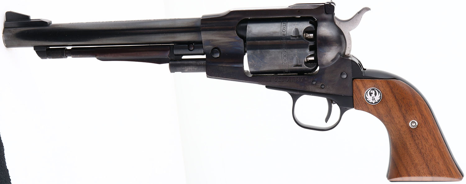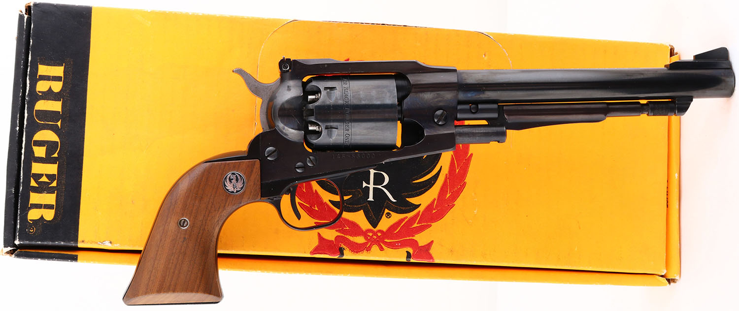 Ruger, Old Army, CAL: 44 (.457 Ball Diameter), MFG: 1987, SN: 145-53000, Single Action Black Powder Revolver, 7 1/2'' barrel. The Ruger logo medallion wood grips are excellent. The metal blue finish is excellent. Bore is excellent & minty Comes in Ruger non-matching box, with label on the left end. Black Powder, No FFL Req - Value: 350 to 700