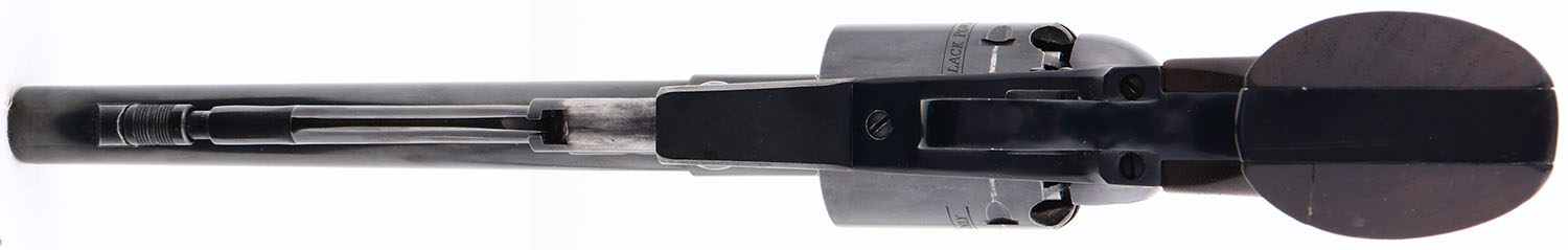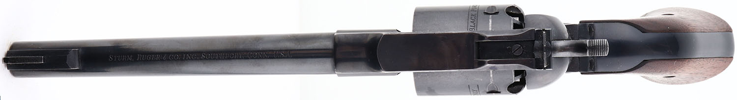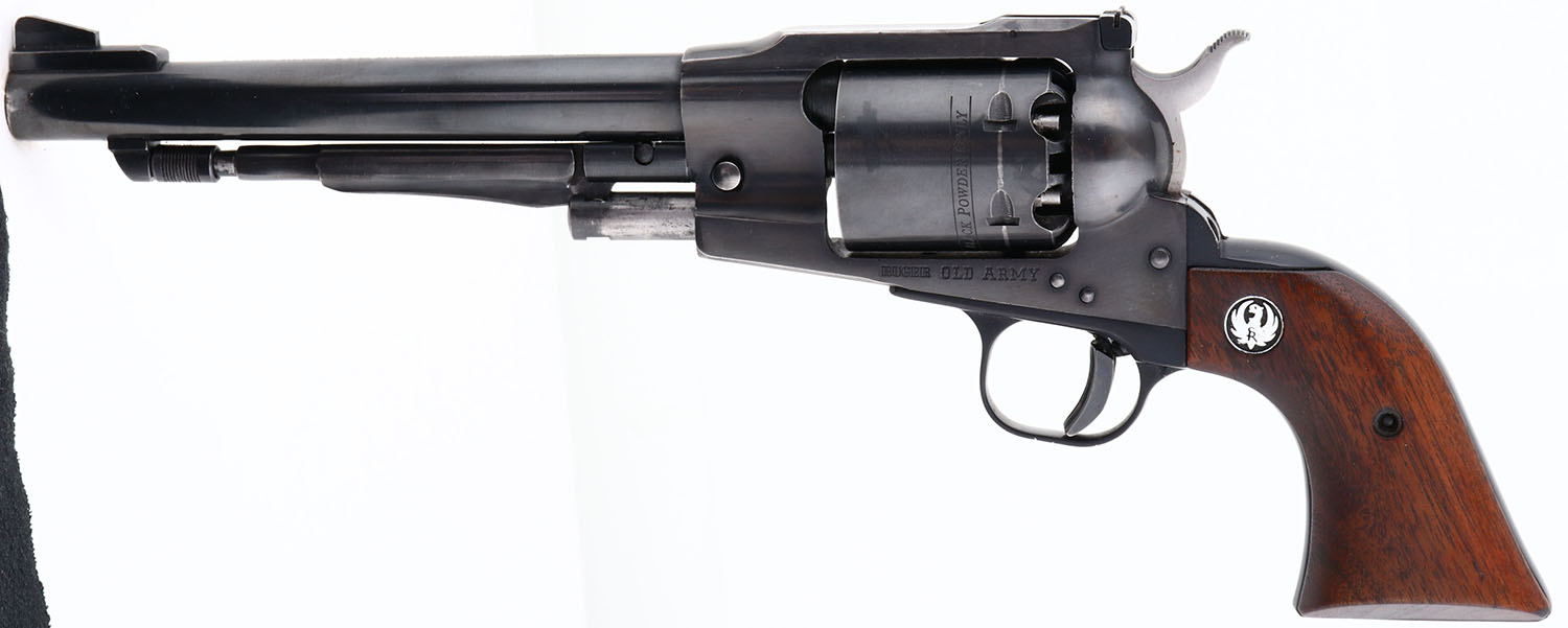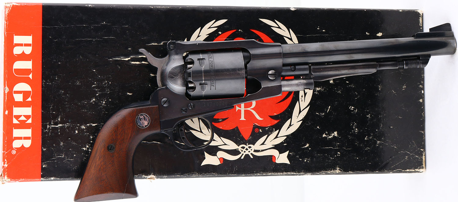 BOXED, Ruger, Old Army, CAL: 45 , MFG: 1973, SN: 140-02260, Single Action Black Powder Revolver, 7 1/2'' barrel. The Ruger logo medallion wood grips are very good. The right grip has a repaired edge crack. The metal blue finish is excellent, rating 97%. Bore is excellent & minty. Factory sights. Comes in original box. Box has shelf wear & one corner seam split. Black Powder, No FFL Req. - Value: 350 to 700