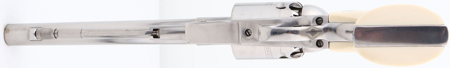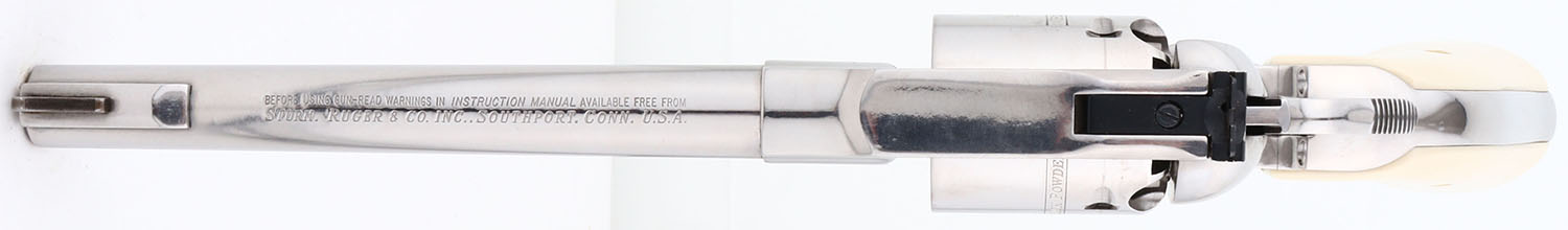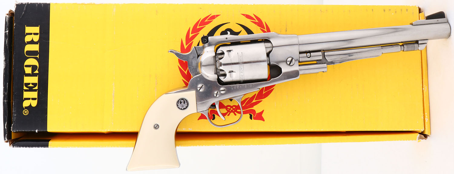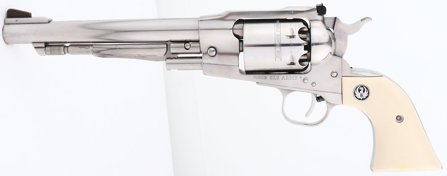 BOXED, Ruger, Old Army, CAL: 44 (.457 Ball Diameter), MFG: 1995, SN: 145-79090, Single Action Black Powder Revolver, 7 1/2'' barrel. The Ruger logo medallion faux ivory grips are excellent. The polished stainless steel finish is excellent, with numerous fine brush lines, consistent with this type of finish. Bore is excellent. Factory sights. Comes in Ruger box, no labels, with owners manual & tool. Black Powder, No FFL Req. - Value: 350 to 700