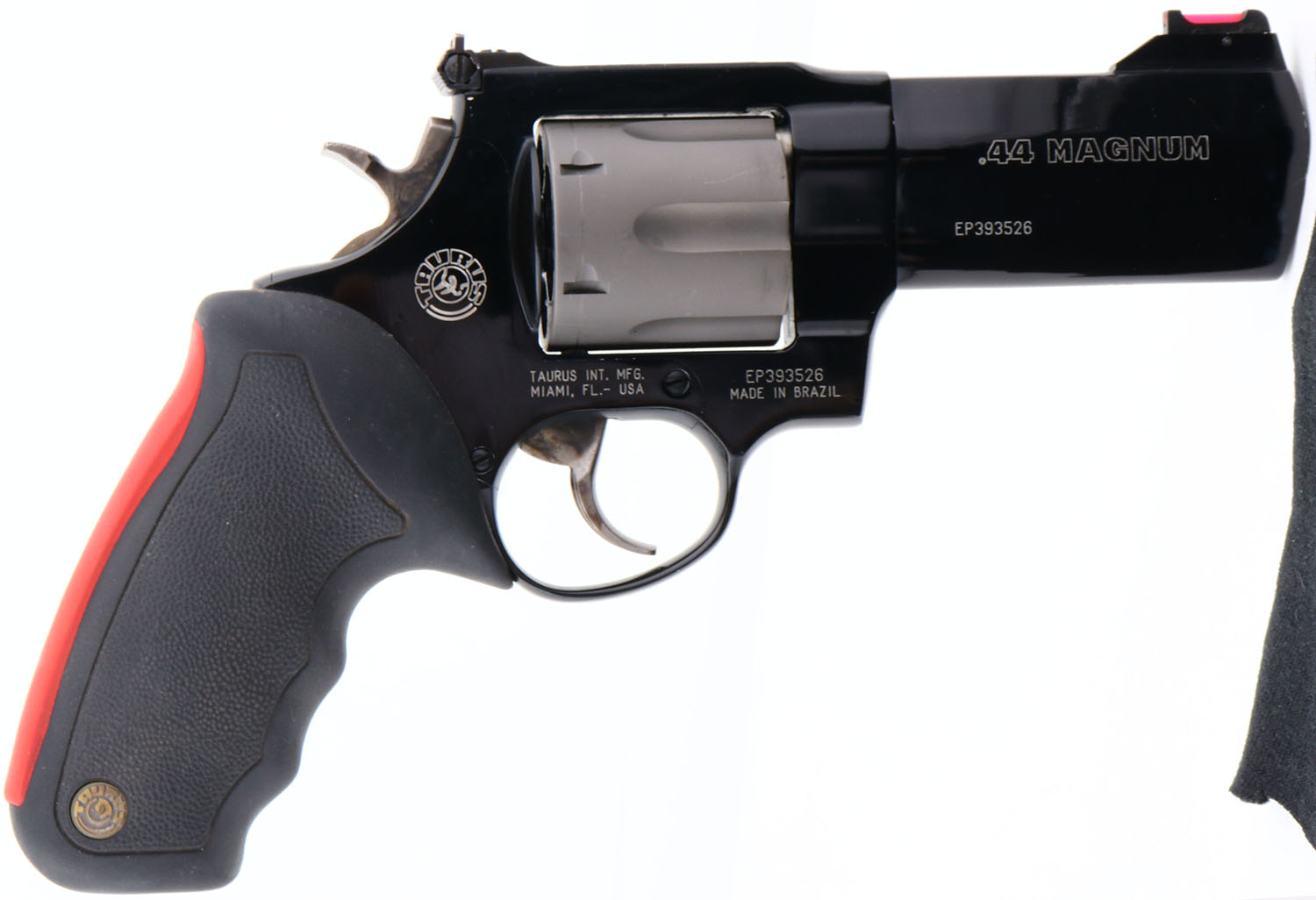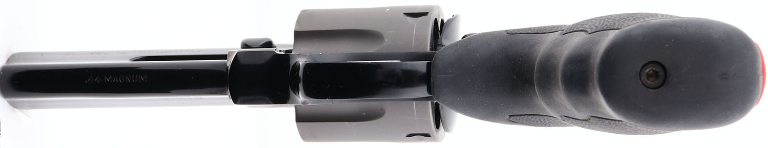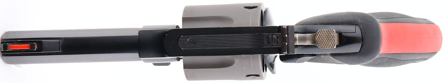 Taurus, Raging Bull Ultra-Lite 444, CAL: 44 MAG, MFG: Modern, SN: EP393526, Double Action Revolver, 4'' barrel. The original, Taurus logo medallion two tone rubber grips are excellent. The Titanium blued finish rates 99% overall. The satin silver finish on the cylinder is excellent, with a faint drag line. Bore is excellent. The frame holds an adjustable rear sight & ramp elevated red fiber optic front sight. This super light, six round Multi-Alloy revolver is the perfect body guard for those hunts that are a little extra hairy. At just 28 ounces you wont even notice it's there until you need it. FFL Req. - Value: 500 to 1000