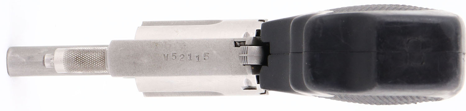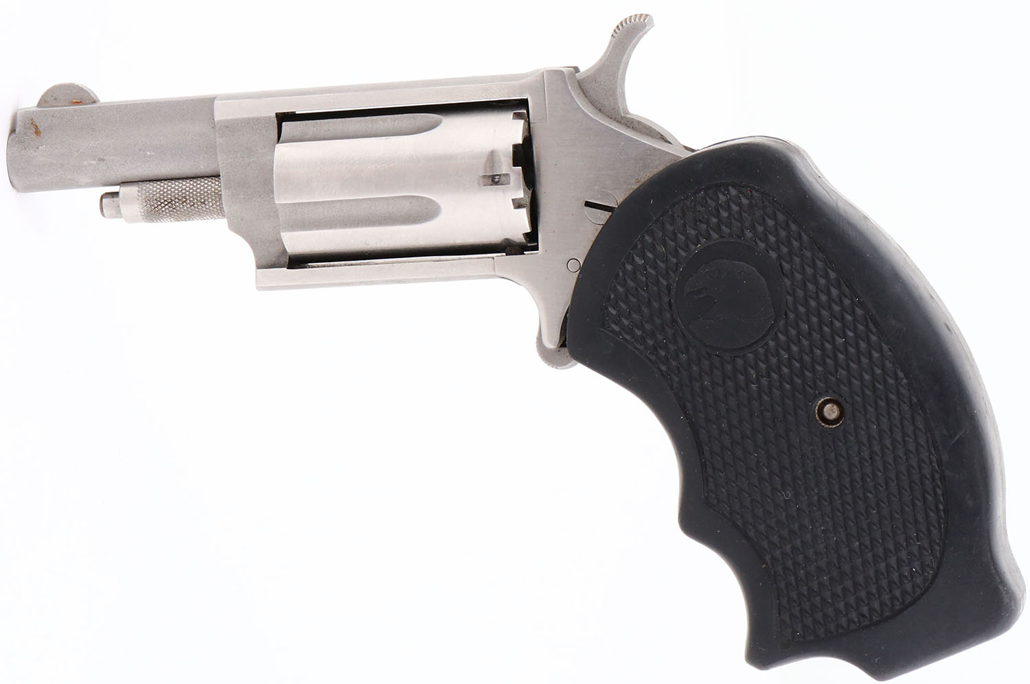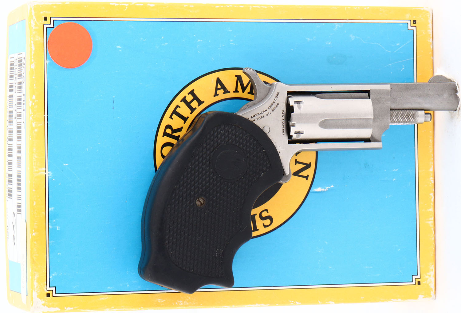 BOXED, North American Arms, 22 Mag Mini Revolver, CAL: 22 MAG, MFG: Modern, SN: W52115, Single Action Revolver, 1 5/8'' barrel. The oversized, NAA logo rubber grips are excellent, with handling marks & scuffs. The satin silver finish is excellent, with minor scuffs & scrapes. Bore is excellent & bright. Factory sights. Comes in non-matching SN box. FFL Req. - Value: 100 to 250