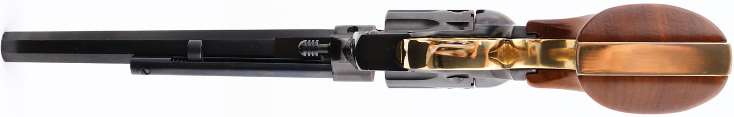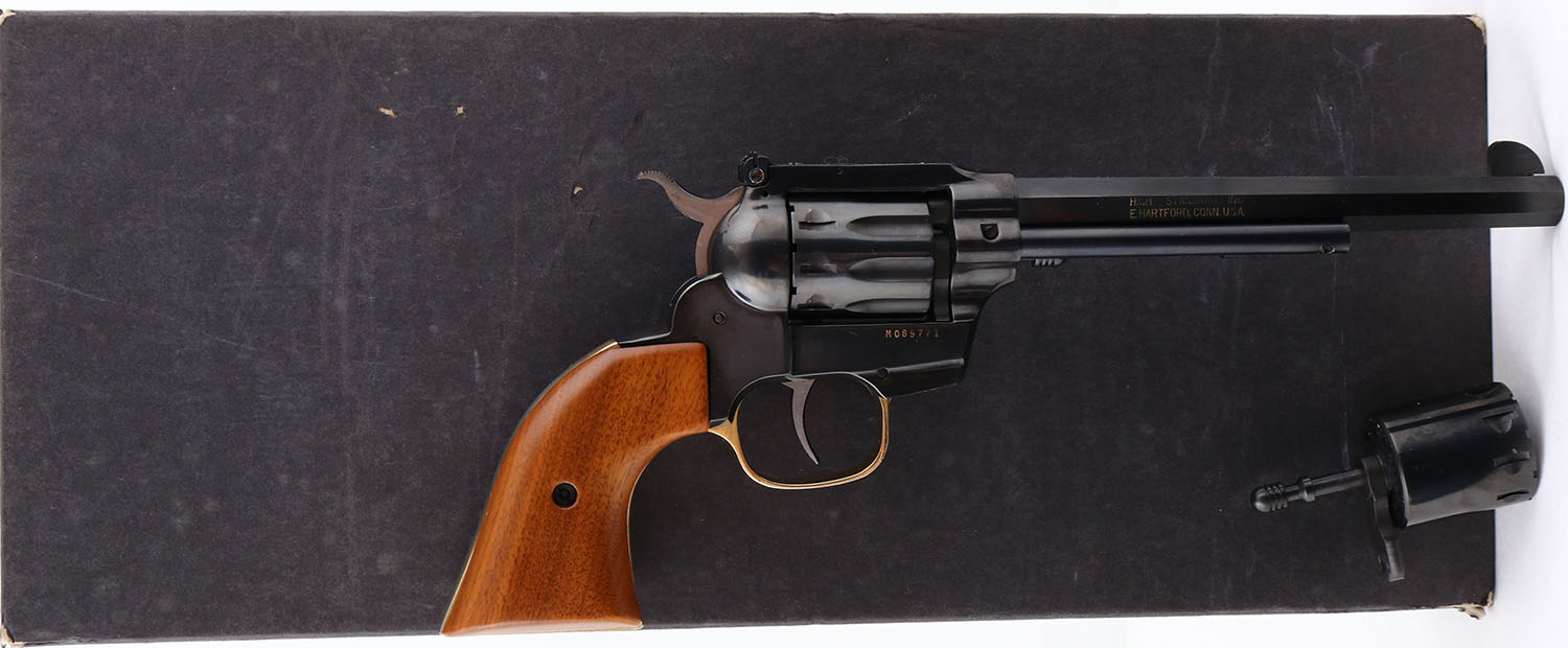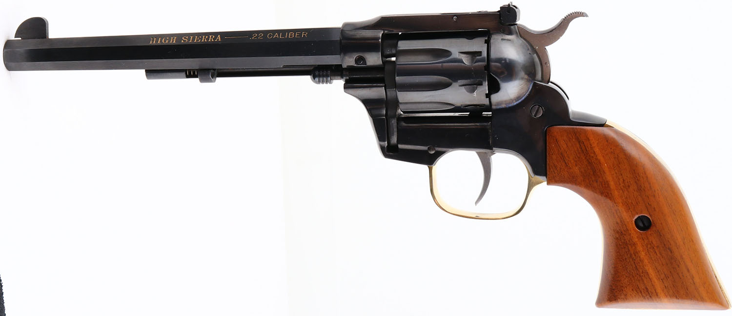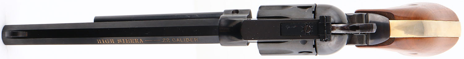 BOXED, High Standard, Model ''High Sierra'', CAL: 22 LR/WMR, MFG: 1973-84, SN: M085771, Double Action Revolver, 9 Shot 22LR & 22 WMR cylinders. 7'' barrel. The wood grips are excellent & minty. The metal blue finish rates 99% overall. The gold wash trigger guard is excellent & minty. The gold toned lettering is excellent, slightly faded on the right side of the barrel. Bore is excellent. The frame holds an adjustable rear sight & tall blade front sight. Comes in original box, with 22 WMR cylinder & paperwork. FFL Req. - Value: 400 to 800