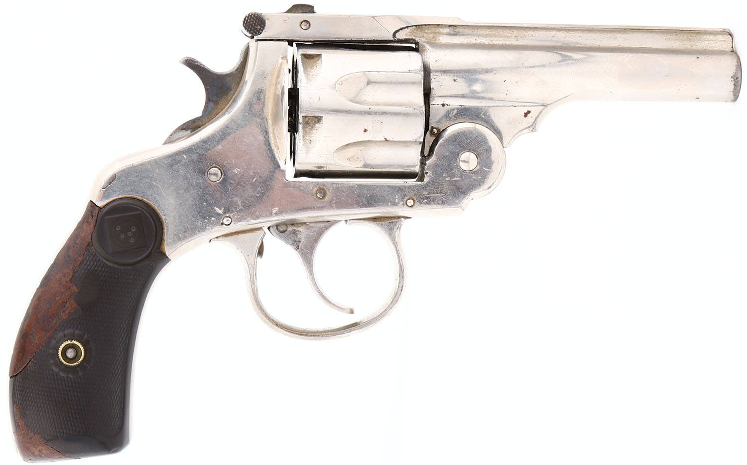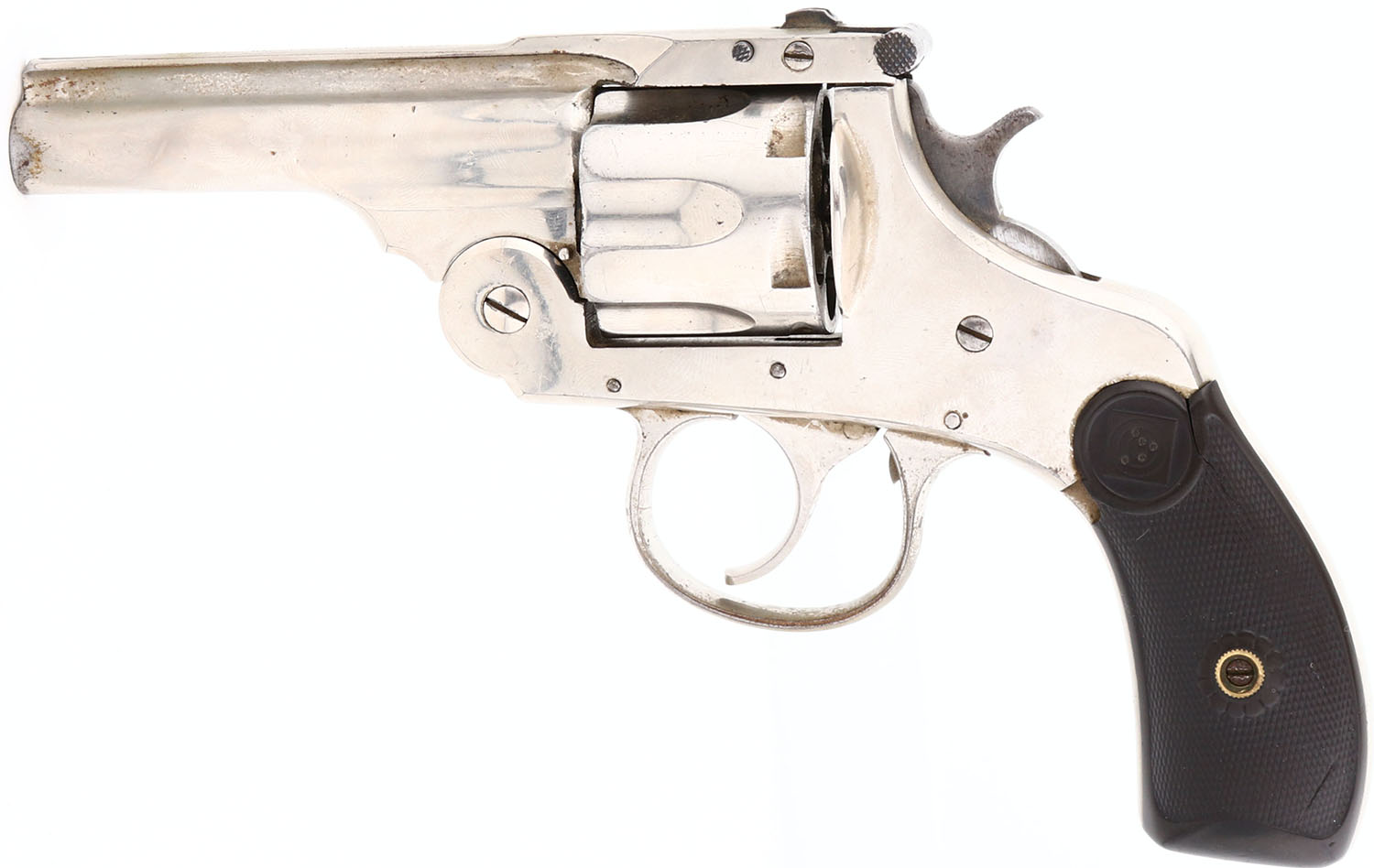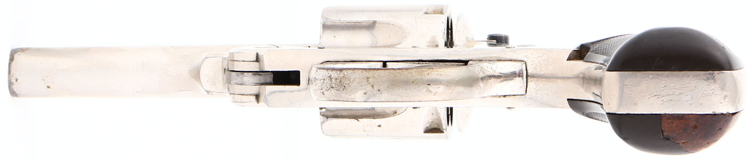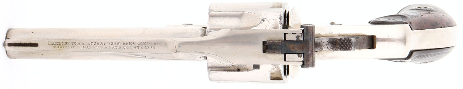 Harrington & Richardson Arms Company, Large Frame, First Model, CAL: 32, MFG: 1884, SN: 471, Double/Single Action Revolver, 3 1/4'' barrel. The original target logo hard rubber grips are good. There are two large areas of filler on the right grip & a small edge chip on the left grip. The nickel finish rates 90% overall, with areas of light spotting, toned to a brown patina & visible brush lines, consistent with this type of finish. Bore is very good, with consistent roughness & pitting. The frame holds a fixed notch rear sight & the barrel has an open front sight provision. Antique, No FFL Req. - Value: 150 to 350