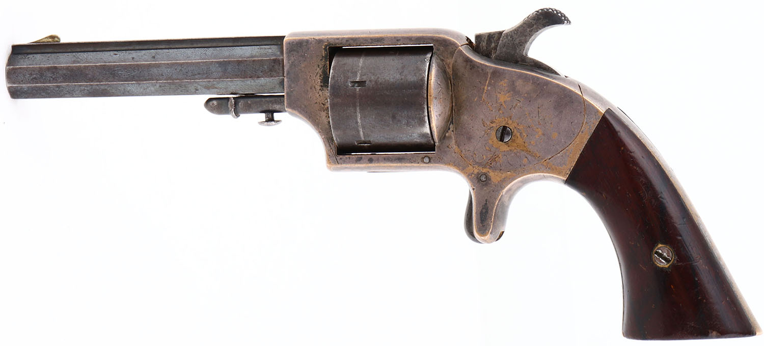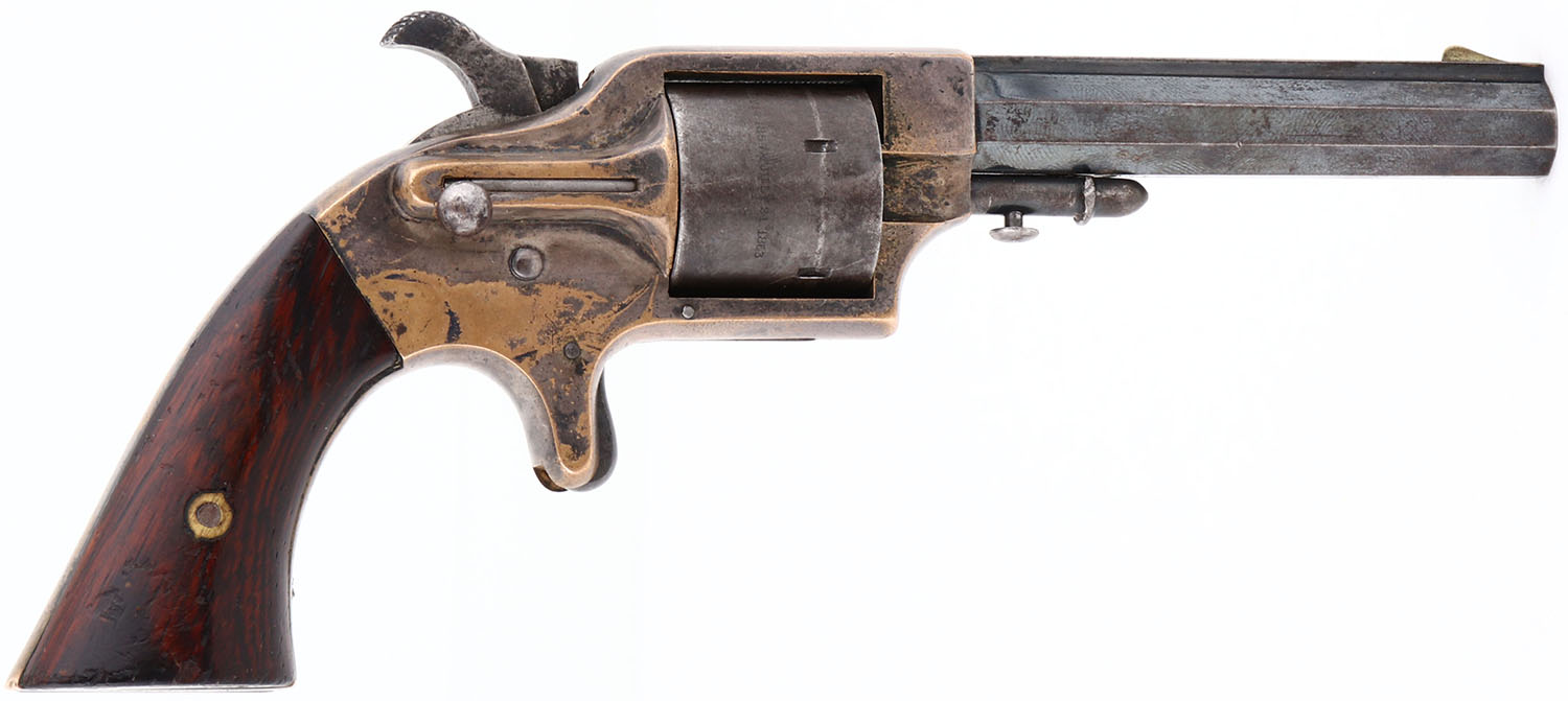 Merwin & Bray Fire Arms Co, 3rd Model Plant Pocket Pistol, CAL: .30 Cup-Fire, MFG: 1860's, SN: 2876, Single Action Cup-Fire Revolver, 3 1/2'' octagon barrel. The wood grips are excellent & solid, with contusions, scrapes & small areas of flaking finish. The top rib of the barrel is marked ''MERWIN & BRAY FIRE ARMS CO. N.Y''. The cylinder is marked in a single line ''PATENTED JULY 12, 1859 & JULY 21, 1863''. The original metal blue finish on the barrel rates 85%, with edges worn to gun metal grey & toned to a brown patina. The brass receiver is silver plated, retaining 65% coverage, with areas flaking revealing the brass frame. Bore is excellent & bright, with intermittent pitting. The barrel holds a small blade front sight. Matching SN on the bottom of the barrel & butt. Tip of the hammer is broken off. These early cartridge guns are intriguing, as they represent the rough path that the firearms industry traveled during the Civil War period. These early cartridge revolvers saw significant use with private soldiers & officers during the course of the war. This example would be a fine inclusion to any collection of Civil War era revolvers. This particular pistol is paired with a box of ammunition in our Rifle/Pistol category. To view the ammo box, please go to lot number 30014 in our current auction. Antique, No FFL Req. - Value: 400 to 1000